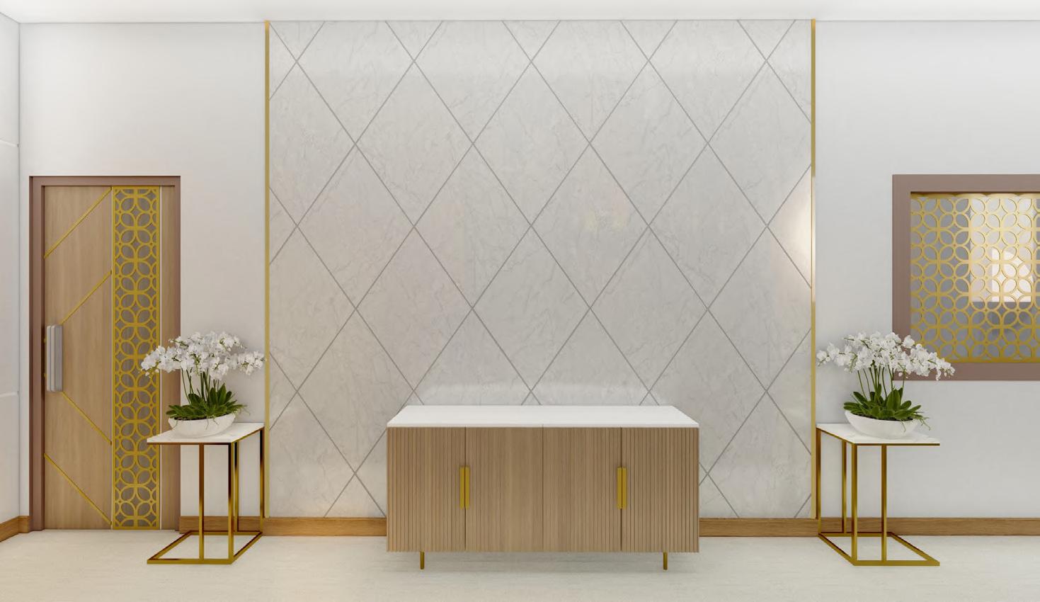 exposing the main staircase that circles gracefully in the main lobby, the main idea of developing this lobby concept is to highlight the staircase design that is quite iconic for building users. the strategy is to create a staircase design that is integrated with the reception desk, providing a breathing space at the end of the lobby that can function as a decorative wall. the living room partition is also made as dynamic as possible so that the connection between the spaces can be felt and to elegantly expose the hanging lamp in the middle of the room.