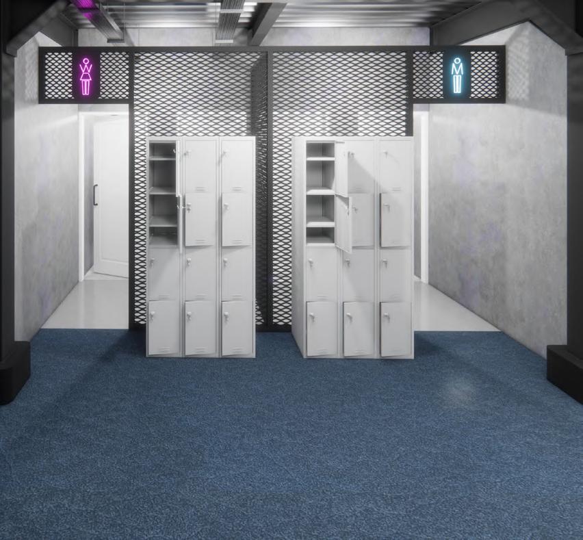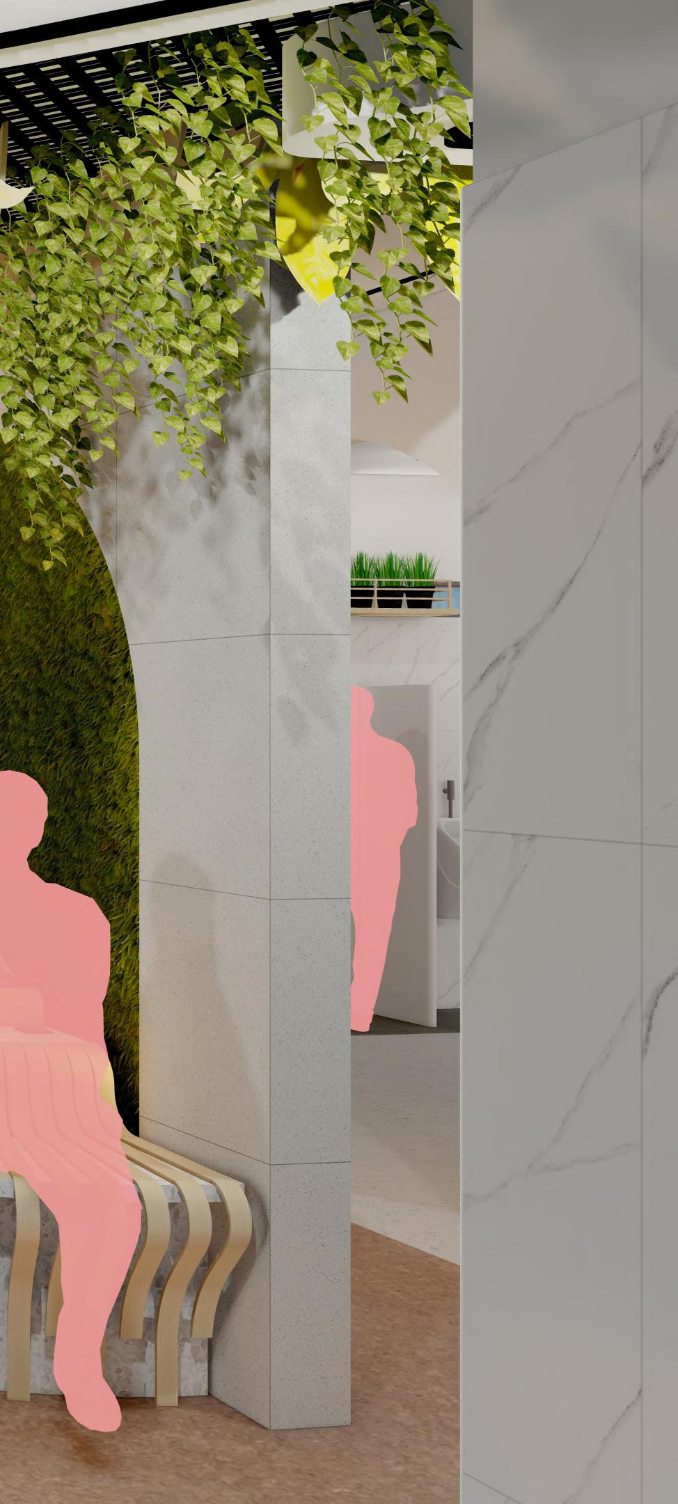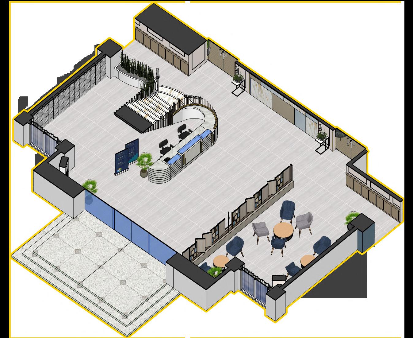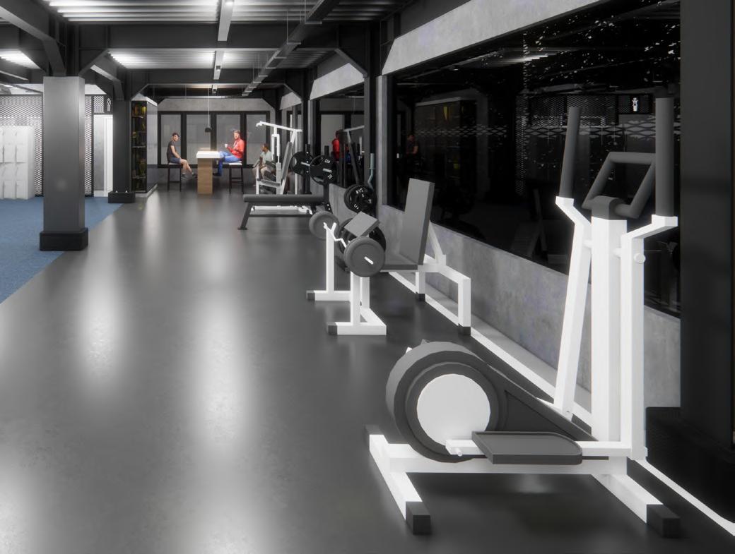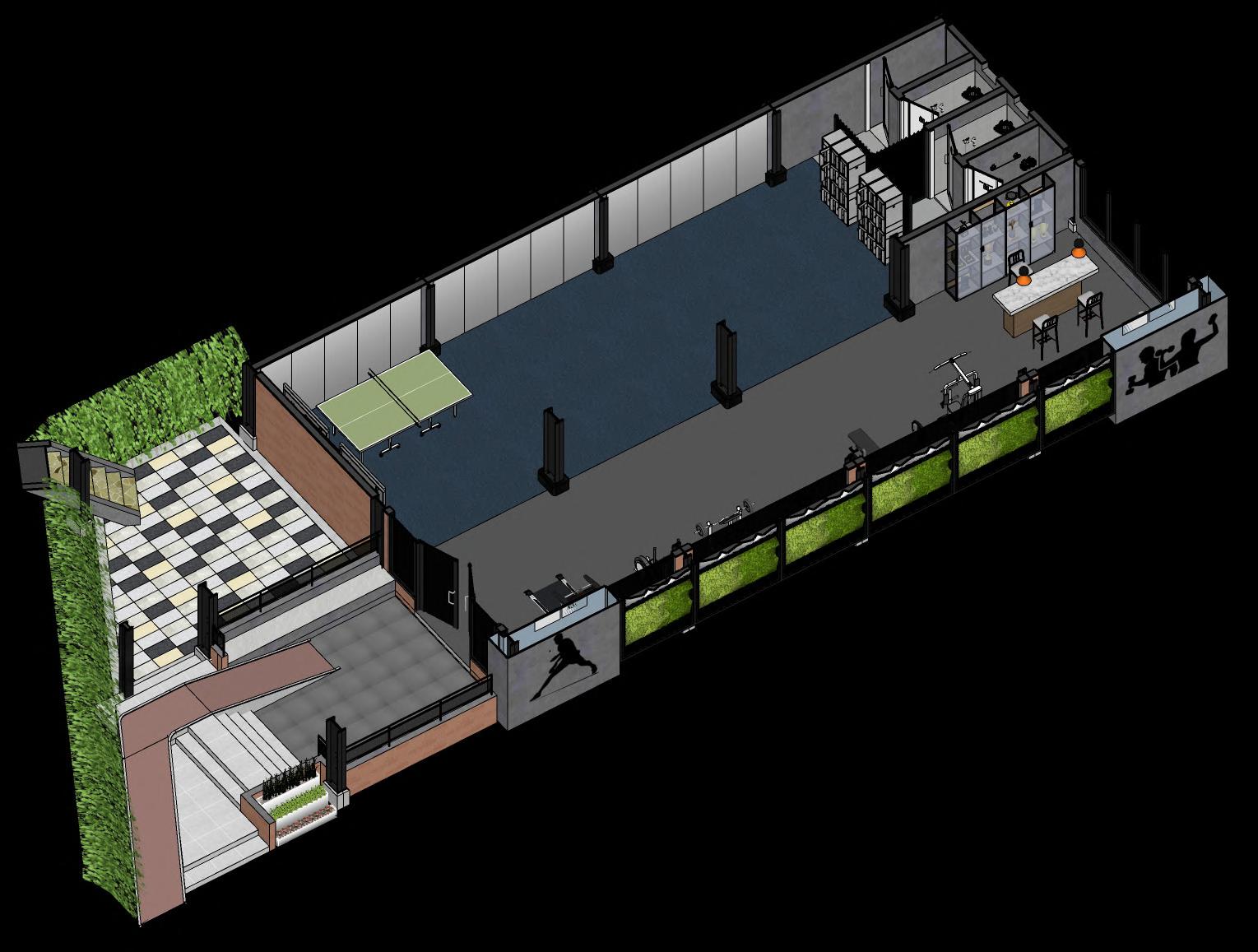 Repurposing the building’s parking area— characterized by exposed steel and brick construction—this space is envisioned as a fully integrated fitness center. A key design challenge lies in the necessary elevation adjustment, which precludes the application of conventional ceiling treatments. This constraint is resolved through an exposed Bondek slab system, embracing an industrial aesthetic while ensuring structural coherence and spatial continuity.