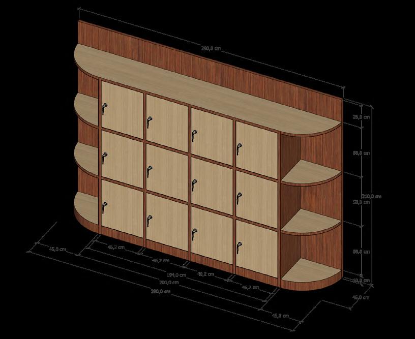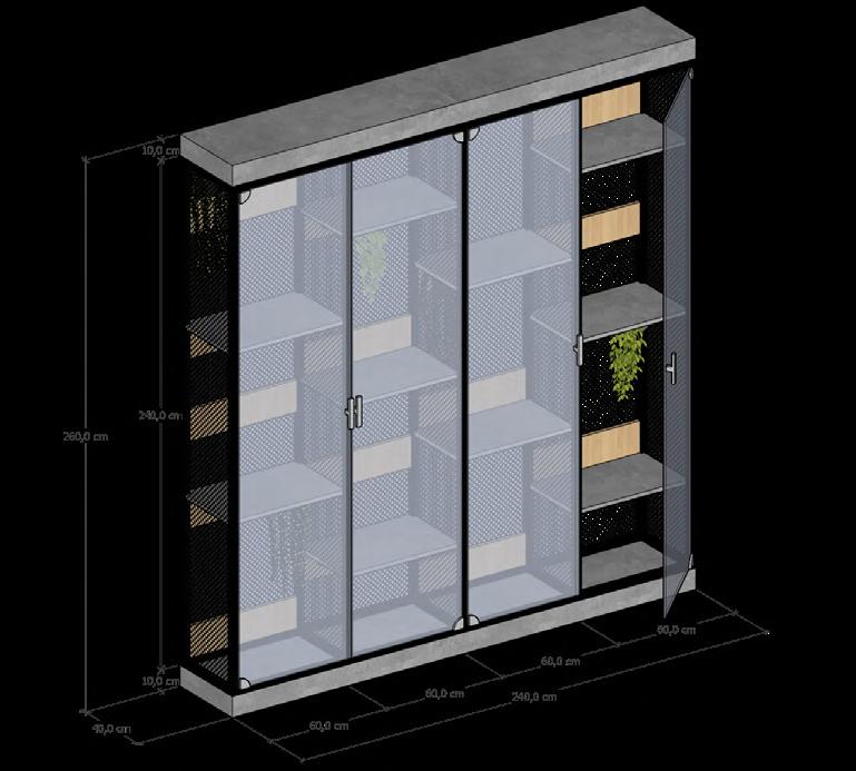 To enhance the modern industrial aesthetic, the furniture design incorporates steel, wire mesh, and glass doors, creating a refined material palette that reinforces a contemporary visual identity while maintaining structural clarity and transparency.