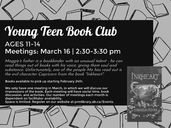 March 16th at 2:30 to 3:30pm. This month we will be reading Inkheart by Cornelia Funke. Go to www.prmlibrary.ab.ca/events to register. Books available for pick up February 24th.
