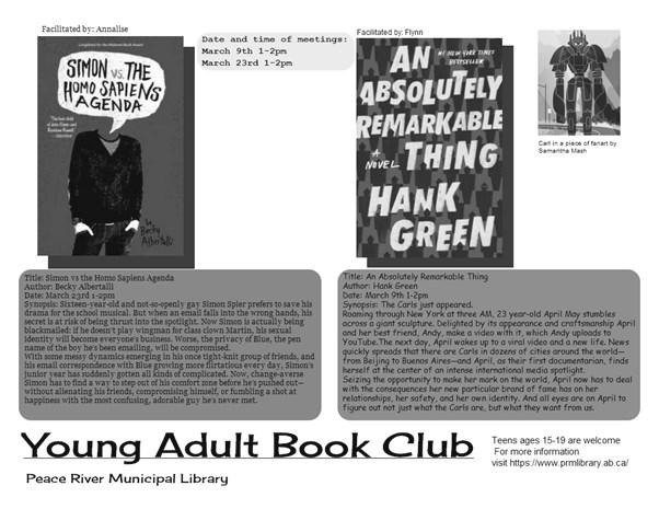 March 9th & 23rd from 1 to 2pm. On March 9th we will be discussing An Absolutely Remarkable Thing by Hank Green with Flynn. On March 23rd we will be discussing Simon vs. the Homo Sapiens Agenda by Becky Albertalli with Annalise. Register at prmlibrary.ab.ca/ events