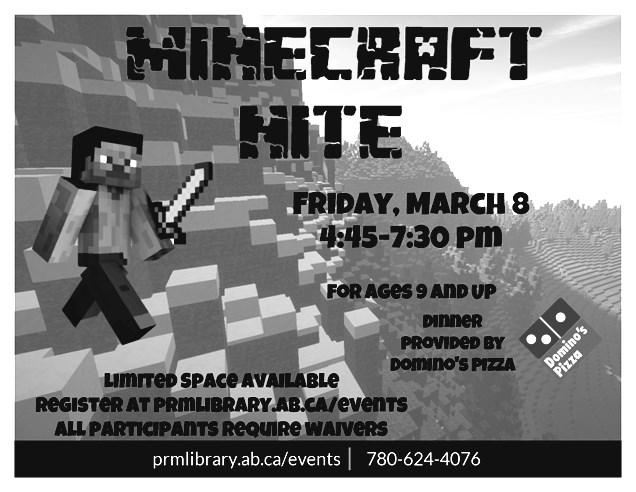 March 8th from 4:45 to 7:30pm. For ages 9+. Food provided by Domino’s Pizza. Register at prmlibrary.ab.ca/events for individual sessions. Additional waivers required (submitted annually) and can be submitted to programs@prmlibrary.ab.ca or dropped off at the library.