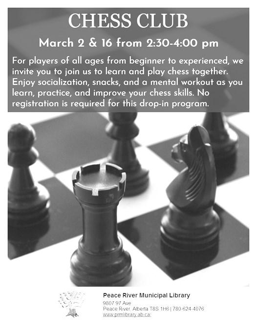 March 2nd & 16th from 2:30 to 4pm. For players of all ages from beginner to experienced, we invite you to join us to learn and play chess together. Enjoy socialization, snacks, and a mental workout as you learn, practice, and improve your chess skills. No registration is required for this drop-in program.