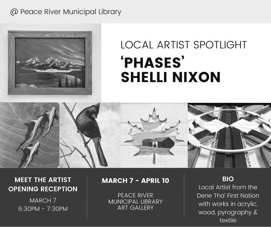Local artist from the Dene Tha’First Nation with works in acrylic, wood, pyrography and textile.