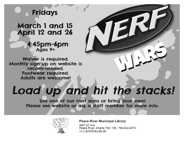 March 5th, 12th, 19th, & 26th from 3:45 to 4:45pm. For avid and reluctant readers alike. For ages 710. Register monthly. Space is limited. Register at prmlibrary.ab.ca/events