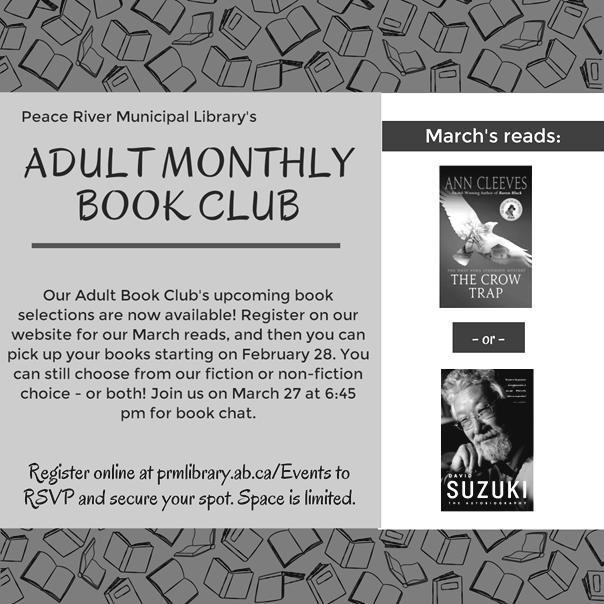 This month we will be discussing The Crow Trap by Ann Cleeves and David Suzuki : the autobiography by David Suzuki. Register at prmlibrary.ab.ca/ events and pick up your book starting February 28th.
