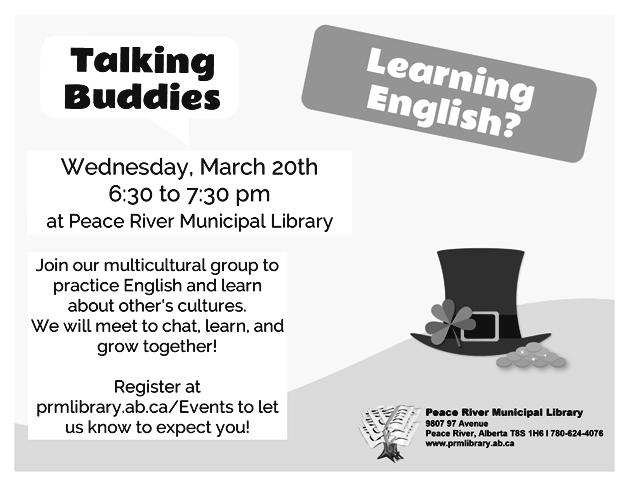 March 20th from 6:30 to 7:30pm. Join Michelle as she leads this multicultural group to practice English and learn about each other’s cultures. We will meet to chat, learn, and grow together. Register at prmlibrary.ab.ca/ events.