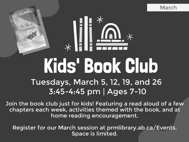 March 5th, 12th, 19th, & 26th from 3:45 to 4:45pm. This month we will be reading The Tale of Despereaux by Kate DiCamillo. Go to www.prmlibrary.ab.ca/ events to register.