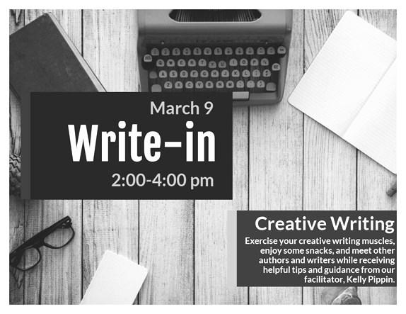 March 9th from 2 to 4pm. Creative Writing. Exercise your creative writing muscles, enjoy some snacks, and meet other authors and writers while receiving helpful tips and guidance from our facilitator, Kelly Pippin.