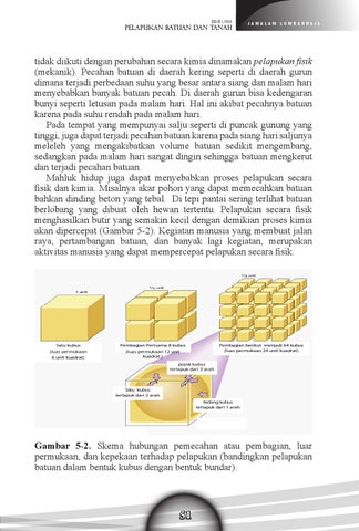 tidak diikuti dengan perubahan secara kimia dinamakan pelapukan fisik (mekanik). Pecahan batuan di daerah kering seperti di daerah gurun dimana terjadi perbedaan suhu yang besar antara siang dan malam hari menyebabkan banyak batuan pecah. Di daerah gurun bisa kedengaran bunyi seperti letusan pada malam hari. Hal ini akibat pecahnya batuan karena pada suhu rendah pada malam hari. Pada tempat yang mempunyai salju seperti di puncak gunung yang tinggi, juga dapat terjadi pecahan batuan karena pada siang hari saljunya meleleh yang mengakibatkan volume batuan sedikit mengembang, sedangkan pada malam hari sangat dingin sehingga batuan mengkerut dan terjadi pecahan batuan. Mahluk hidup juga dapat menyebabkan proses pelapukan secara fisik dan kimia. Misalnya akar pohon yang dapat memecahkan batuan bahkan dinding beton yang tebal. Di tepi pantai sering terlihat batuan berlobang yang dibuat oleh hewan tertentu. Pelapukan secara fisik menghasilkan butir yang semakin kecil dengan demikian proses kimia akan dipercepat (Gambar 5-2). Kegiatan manusia yang membuat jalan raya, pertambangan batuan, dan banyak lagi kegiatan, merupakan aktivitas manusia yang dapat mempercepat pelapukan secara fisik.