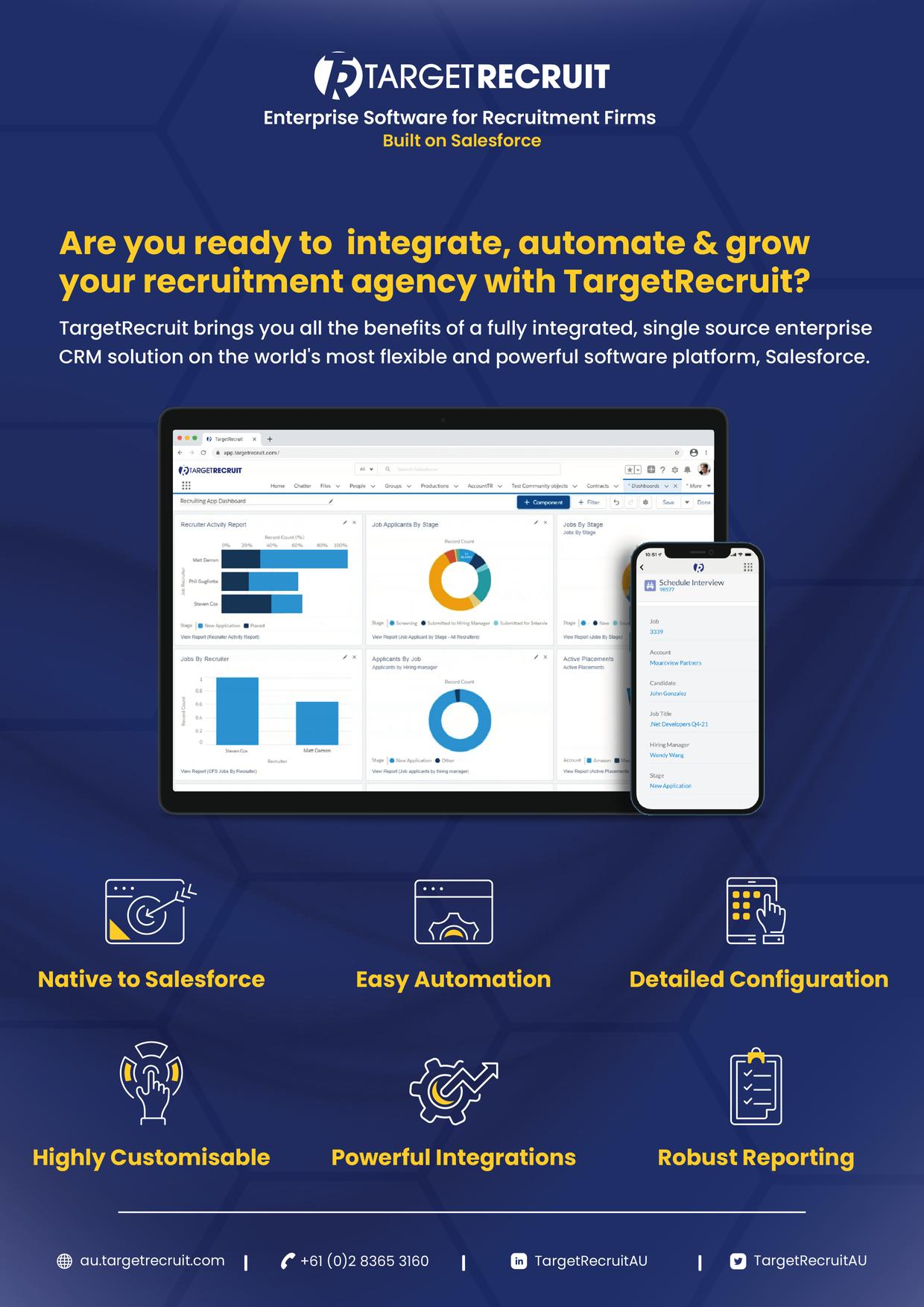 TargetRecruit paves the way as a market leader in advanced recruitment software, offering a comprehensive ATS solution built on the renowned Salesforce platform. With headquarters in Houston and additional offices in London, Bangalore, and now Sydney, this vast network allows the company to leverage its diverse expertise and experience to provide the most advanced software solutions to its clients worldwide