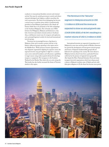 The Revenue in the “Security” segment in Malaysia amounts to USD 1.1 million in 2016 and the revenue is expected to show an annual growth rate (CAGR 2016-2020) of 46.94% resulting in a market volume of USD 5.3 million in 2020 International terrorists are suspected of operating out of Malaysia for some time and the growth of Muslim extremism has spurred the development of home-grown terrorist groups and dozens of disparate fundamentalist groups/cells are believed to be operating in the country. The terror threat to Malaysia, however, doesn’t stem from a particular IS terror outfit, but by the presence of regional terror groups like Abu Sayyaf, the Moro National Liberation Front and many insurgent (terrorist) organisations which have always posed a threat to Malaysia’s northern state of Sabah, and now with their given allegiance to IS, the threat has become more potent.