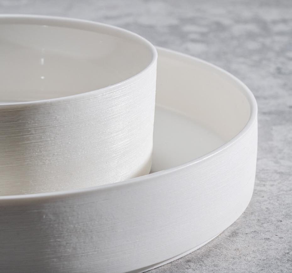 The Contour collection by CHIC combines elegance with a refined twist. This stunning collection, featuring dinner plates, bowls, and serving platters, is crafted from high-quality white porcelain and finished with a lightly reactive glaze. Each piece is thoughtfully designed with solid
