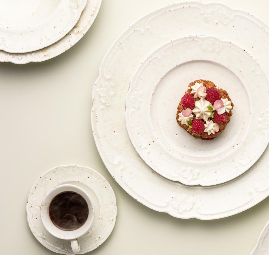 The items from the Floret collection exude rustic charm. The subtle floral relief gives the collection a distinctive appearance. Romantic, timeless and elegant, this porcelain dinnerware is available in matte white. Additionally, all items are finished with a reactive glaze. This reactive glaze produces unique colour nuances for each product. Each item thus becomes a unique work of art that provides a beautiful backdrop for delicious delicacies in a truly special manner.
