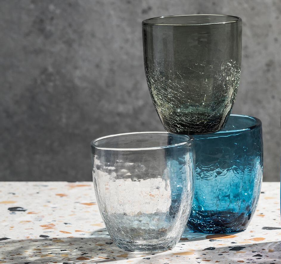Introducing our exquisite glassware collection, “Crackle,” where each piece is meticulously handcrafted and mass coloured to ensure the sustainability of its vibrant hues. This unique process guarantees that our glassware retains its colour brilliance even with frequent use. Each item in the collection boasts a distinctive crackle effect, imparting a charming and textured allure to every beverage served .