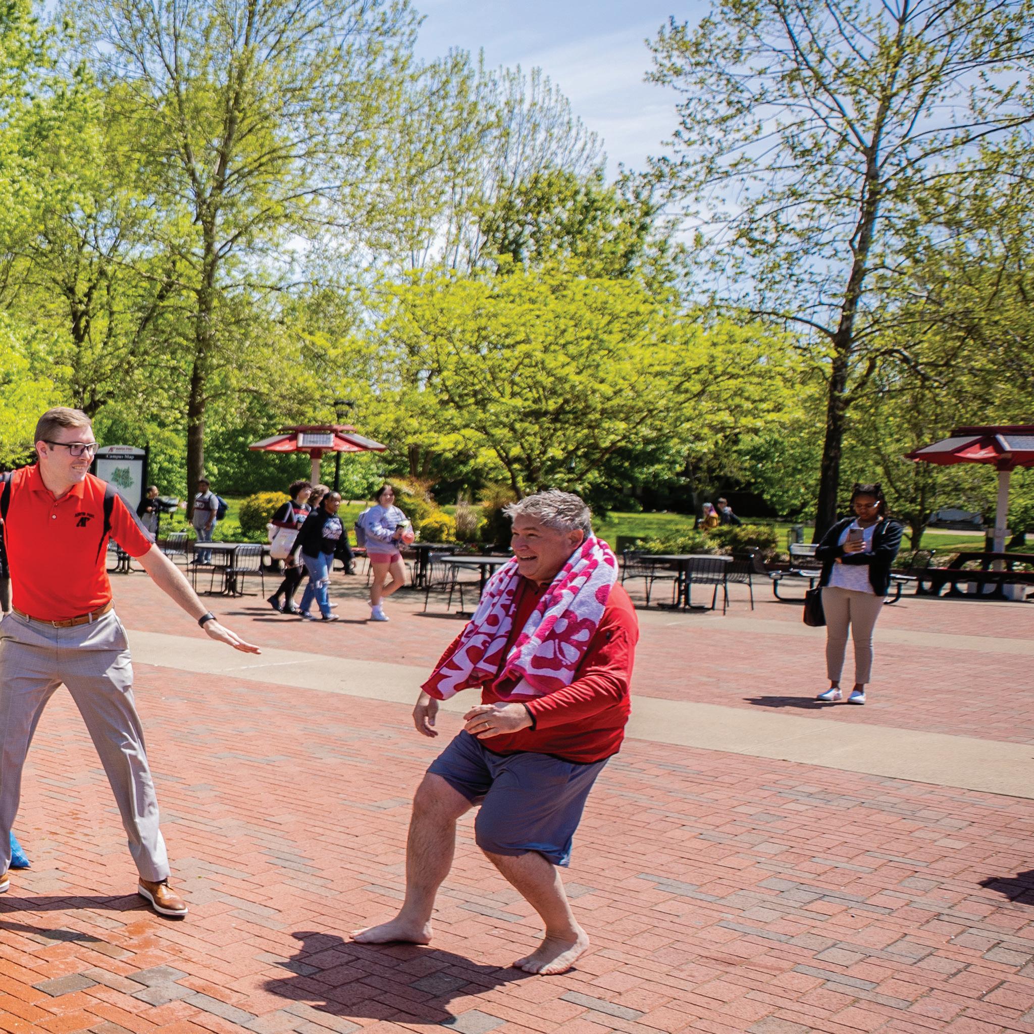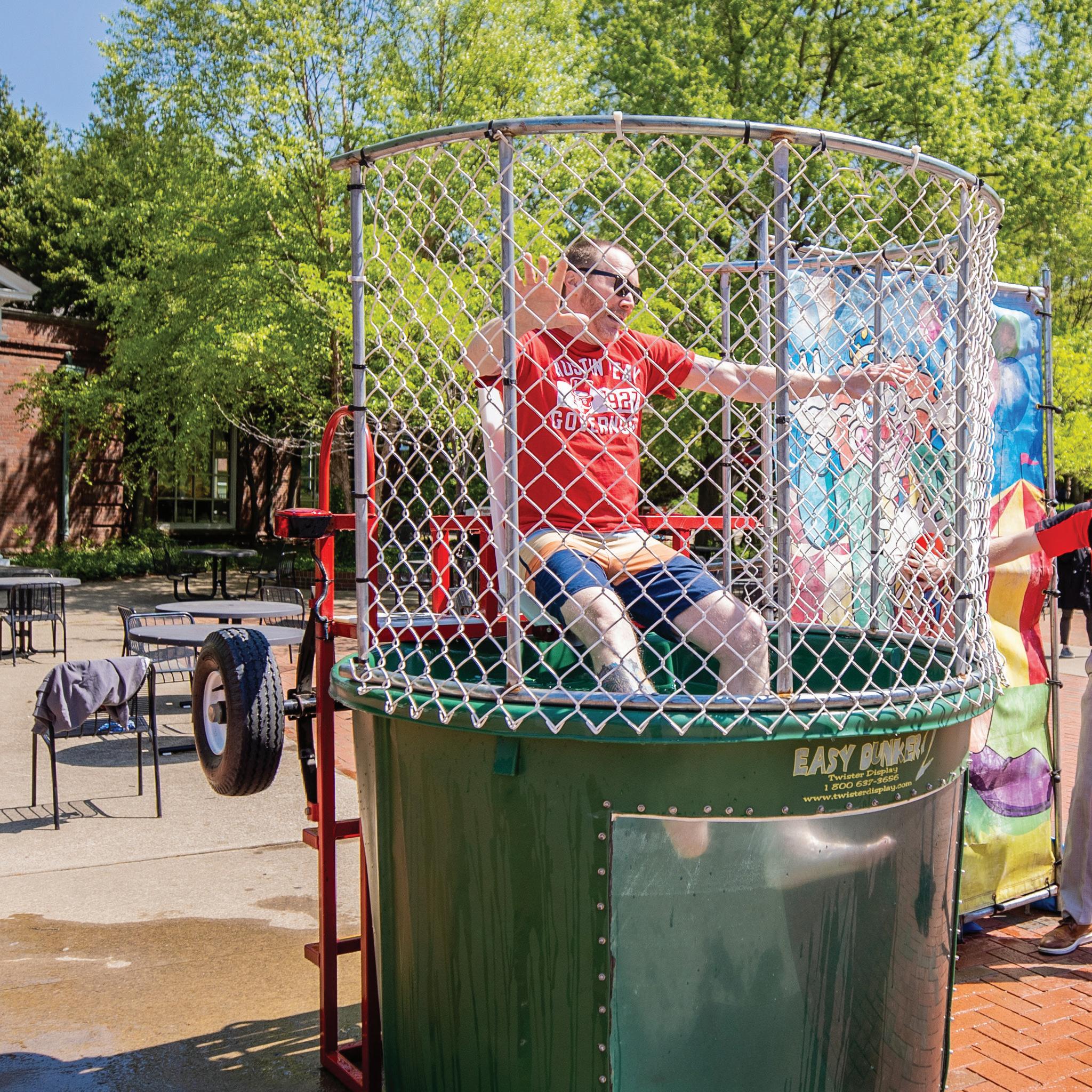 From left, Dr. Tucker Brown, senior vice provost and assistant vice president for academic affairs, Sam Mynhier, assistant director for annual giving and APSU President Mike Licari, participate in the “Dunk The Deans” event, celebrating fundraising efforts by the deans of each college during Govs Give 2022.