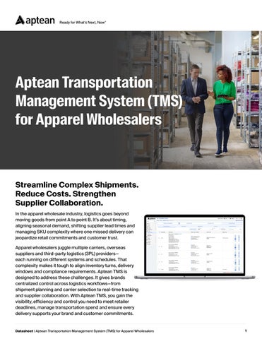 Apparel wholesalers juggle multiple carriers, overseas suppliers and third-party logistics (3PL) providers— each running on different systems and schedules. That complexity makes it tough to align inventory turns, delivery windows and compliance requirements. Aptean TMS is designed to address these challenges. It gives brands centralized control across logistics workflows—from shipment planning and carrier selection to real-time tracking and supplier collaboration. With Aptean TMS, you gain the visibility, efficiency and control you need to meet retailer deadlines, manage transportation spend and ensure every delivery supports your brand and customer commitments.