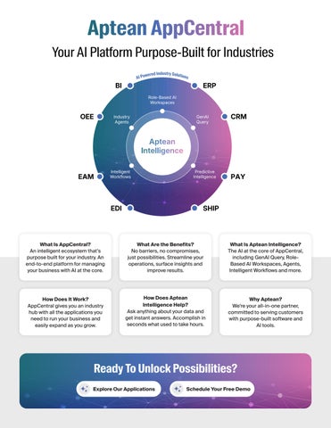 What Is Aptean Intelligence? The AI at the core of AppCentral, including GenAI Query, RoleBased AI Workspaces, Agents, Intelligent Workflows and more.