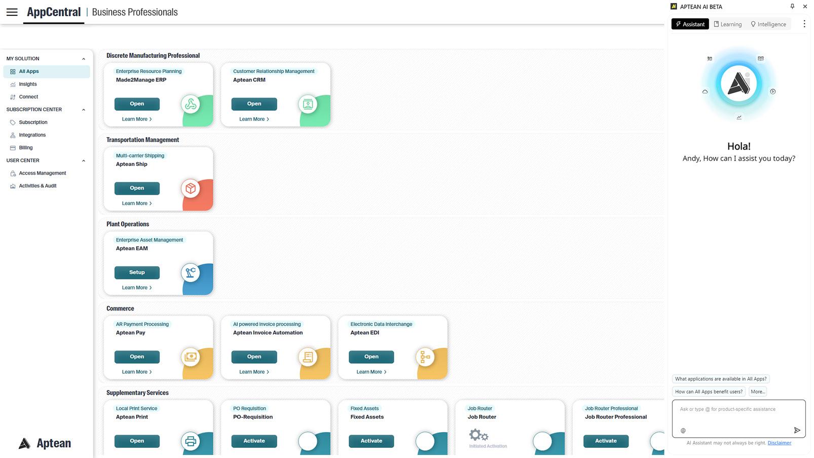 AppCentral, eine neue KI-gestützte Unternehmensplattform von Aptean, zielt darauf ab, diese Herausforderung zu lösen, indem fortschrittliche Technologie für Hersteller jeder Größe praktisch und zugänglich gemacht wird.