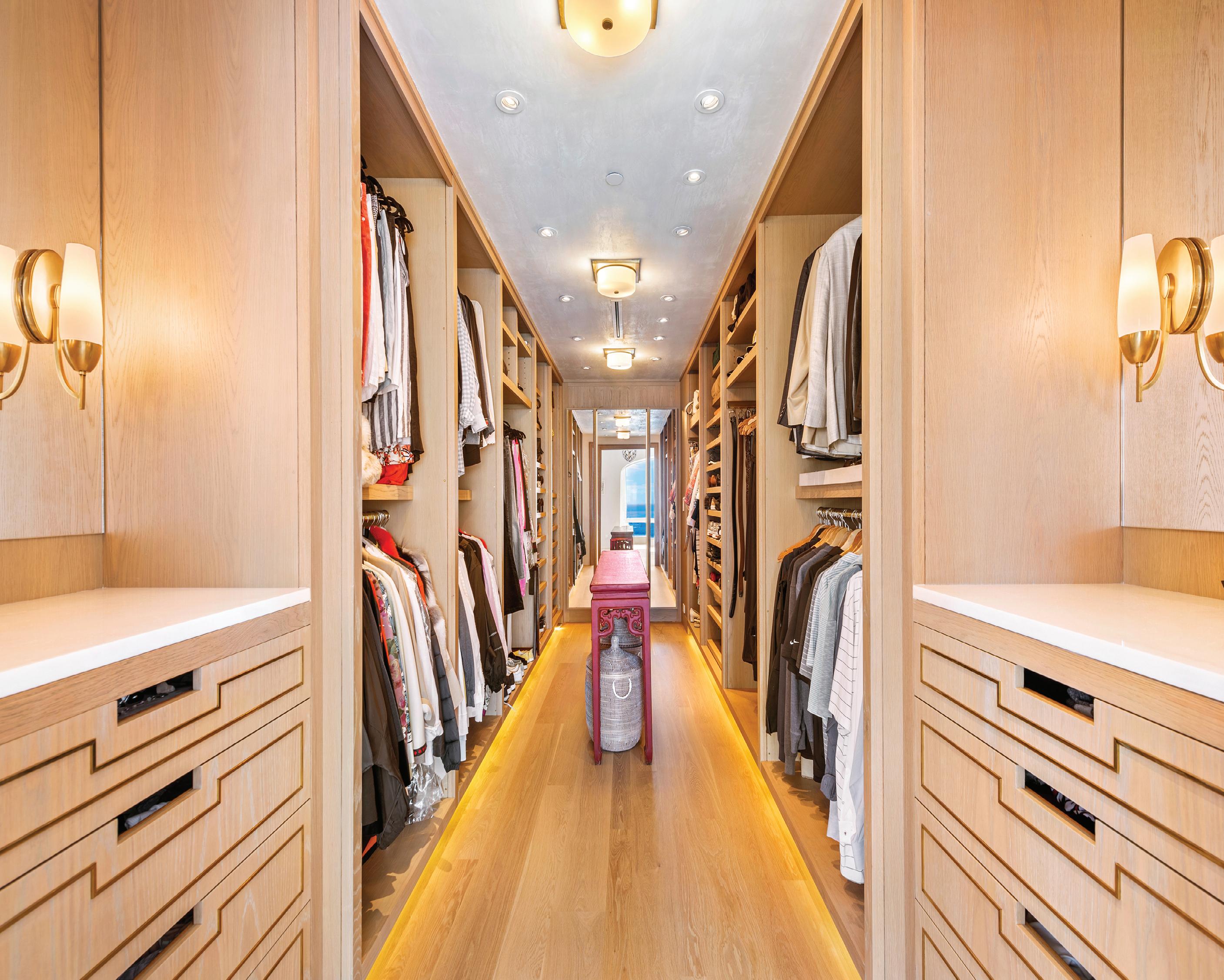 A primary suite with large walk-in closet that, like the home, hints of the Greek isles.