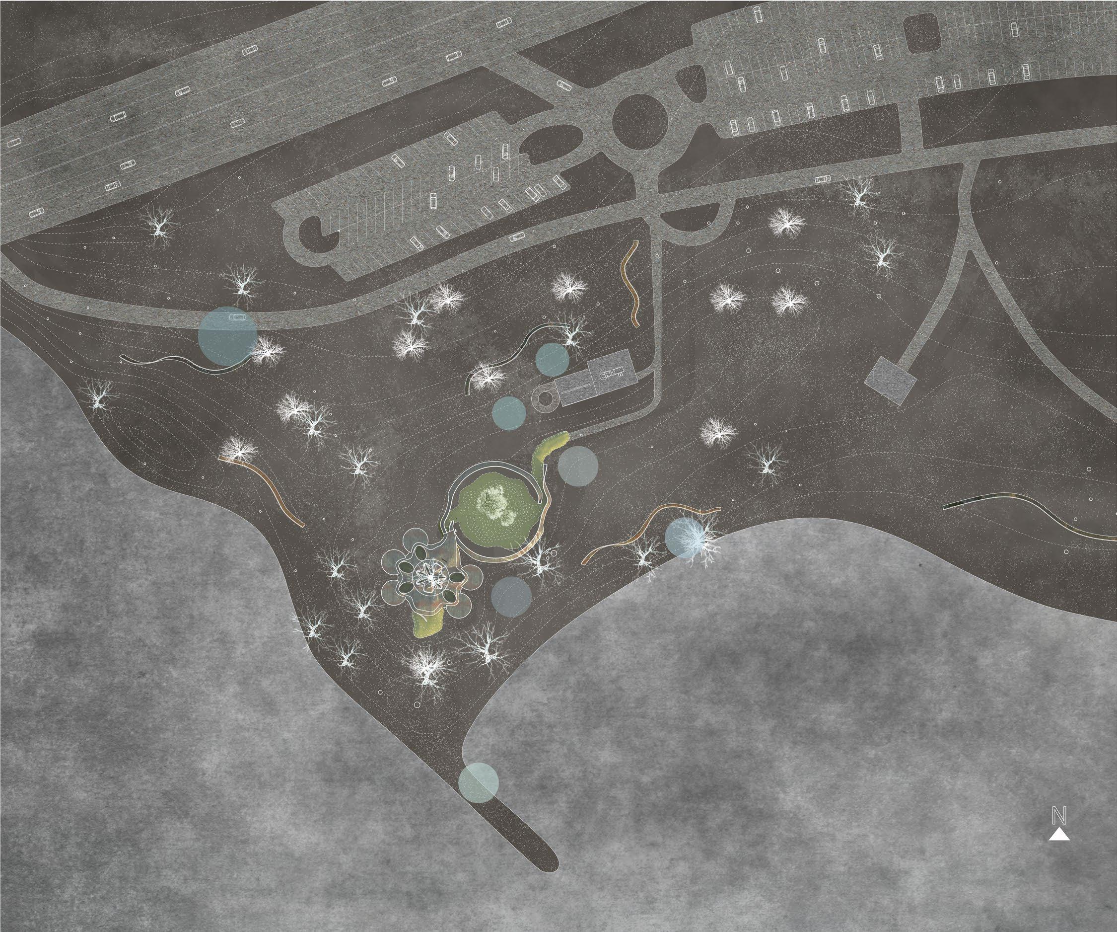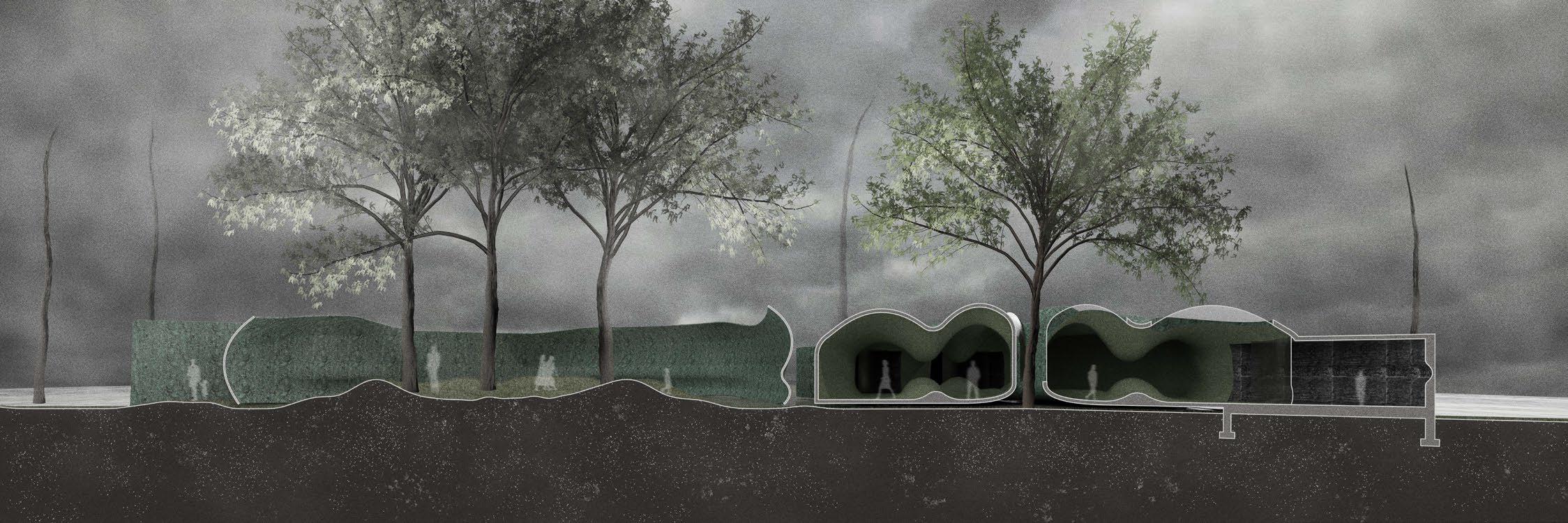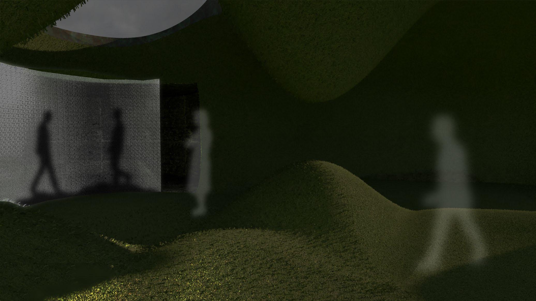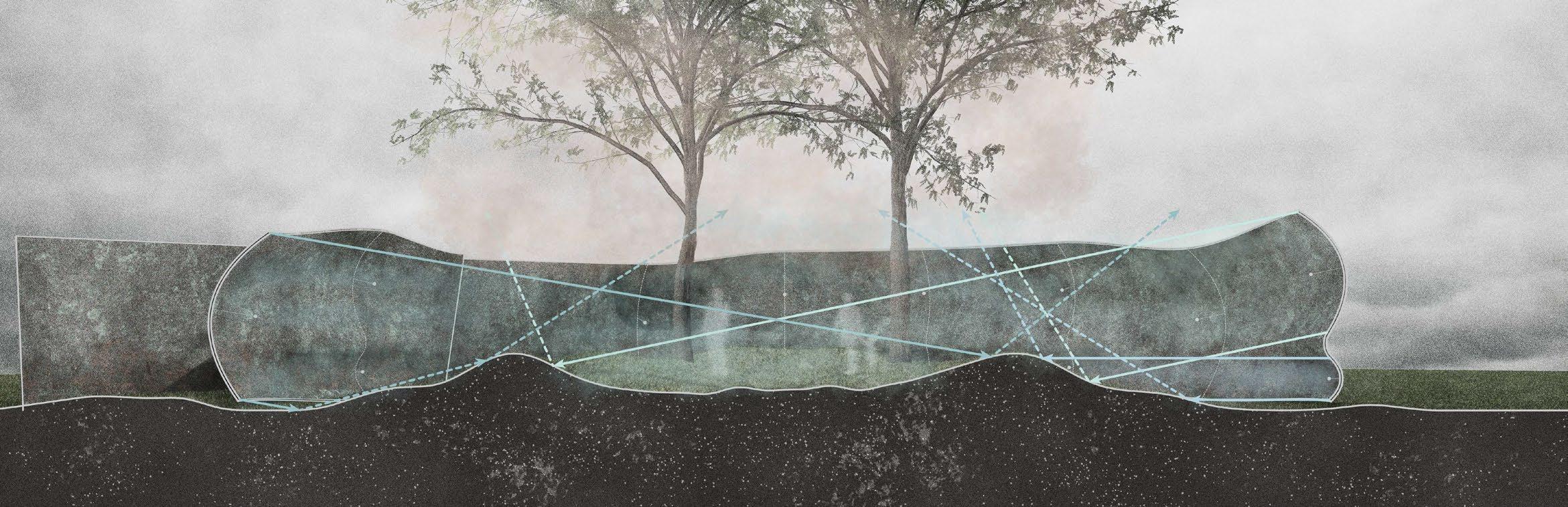 Using sound as a sensory emotional property, the ambition of the project was to create a sequential audio experience calling attention to the sounds of the environment that will be lost or changed in the future because of increasingly volatile weather patterns that lead to flooding. We define infrastructure as an allinclusive term: A network of natural and artificial systems that facilitate sensorial processes of the environment, while also looking at sound as evidence of these systems and forces interacting. The project will also be a witness of time and decay. The single main tree on the right and of intervention, and the copper material that will rust will become a signifier of this inevitable change of what once was.