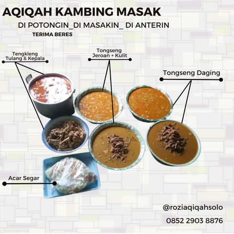 aqiqah kambing yang terdiri dari menu sate, gulai, tengkleng dan tonseng Paket ini menawarkan berbagai pilihan tergantung berapa porsi yang Anda