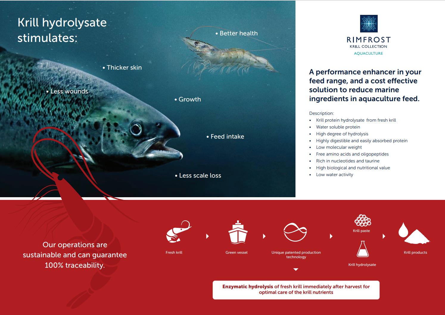 Rimfrost krill hydrolysate can help to increase the feed performance through added appetite and feed ingestion, but also better health and disease resistance. It can also help to reduce the marine ingredients in the feeds, helping in the path to sustainability. Our main markets are the salmon farming countries (Norway, UK, Faroes, Chile, Canada) and the shrimp farming countries (Ecuador, India, Vietnam, Indonesia, Thailand). More information, https://www.rimfrostkrill.com/market/aquaculture