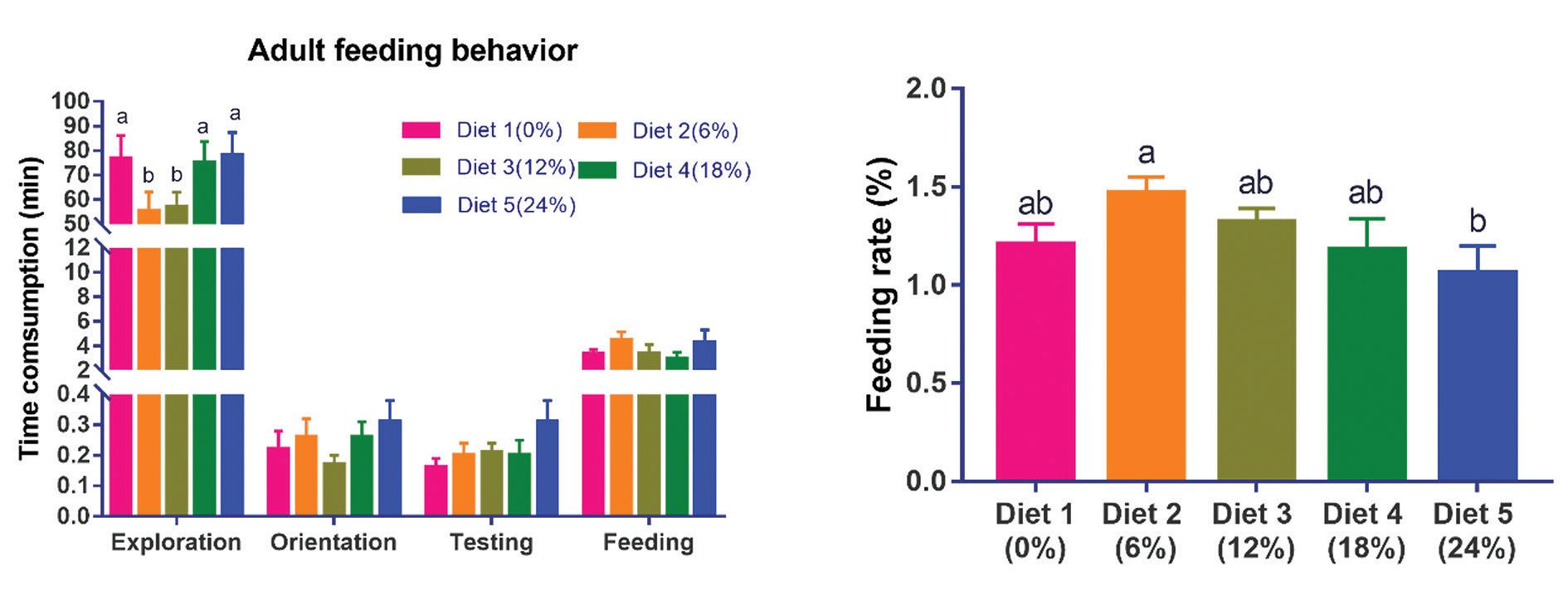 Effect of BSFL puree feed on feeding behavior of juvenile Chinese mitten crabs In the second test, basic crustacean feed incorporating 8-32% BSFL puree was fed to juvenile Chinese mitten crabs. Like in the previous test, BSFL inclusion had no significant effect on the survival rate and growth of juvenile Chinese mitten crabs. But, as can be seen in Figures 3 and 4, the addition of 8-32% BSFL puree significantly improved the feedability, shortened