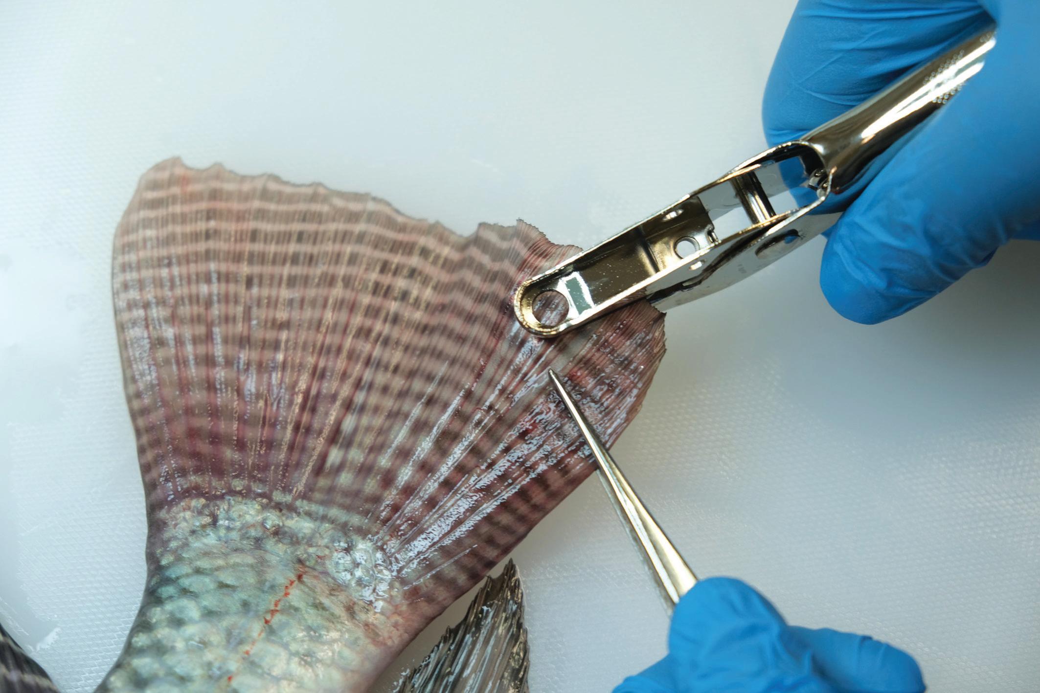 Fin tissue sampling of a Nile tilapia (Oreochromis niloticus) of the GIFT strain. Photo by Trong Trinh and Mahirah Mahmuddin, WorldFish.