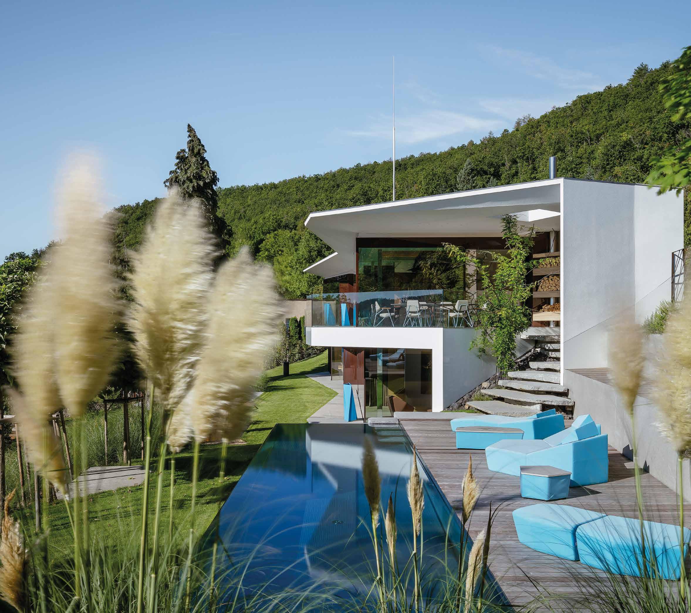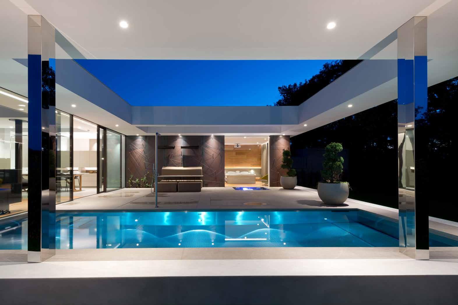 Nadčasovou wellness zónu tvoří nerezový bazén a infinity edge vířivka s trubkovou lavicí pro bublinkovou masáž a několika hydromasážními tryskami.
