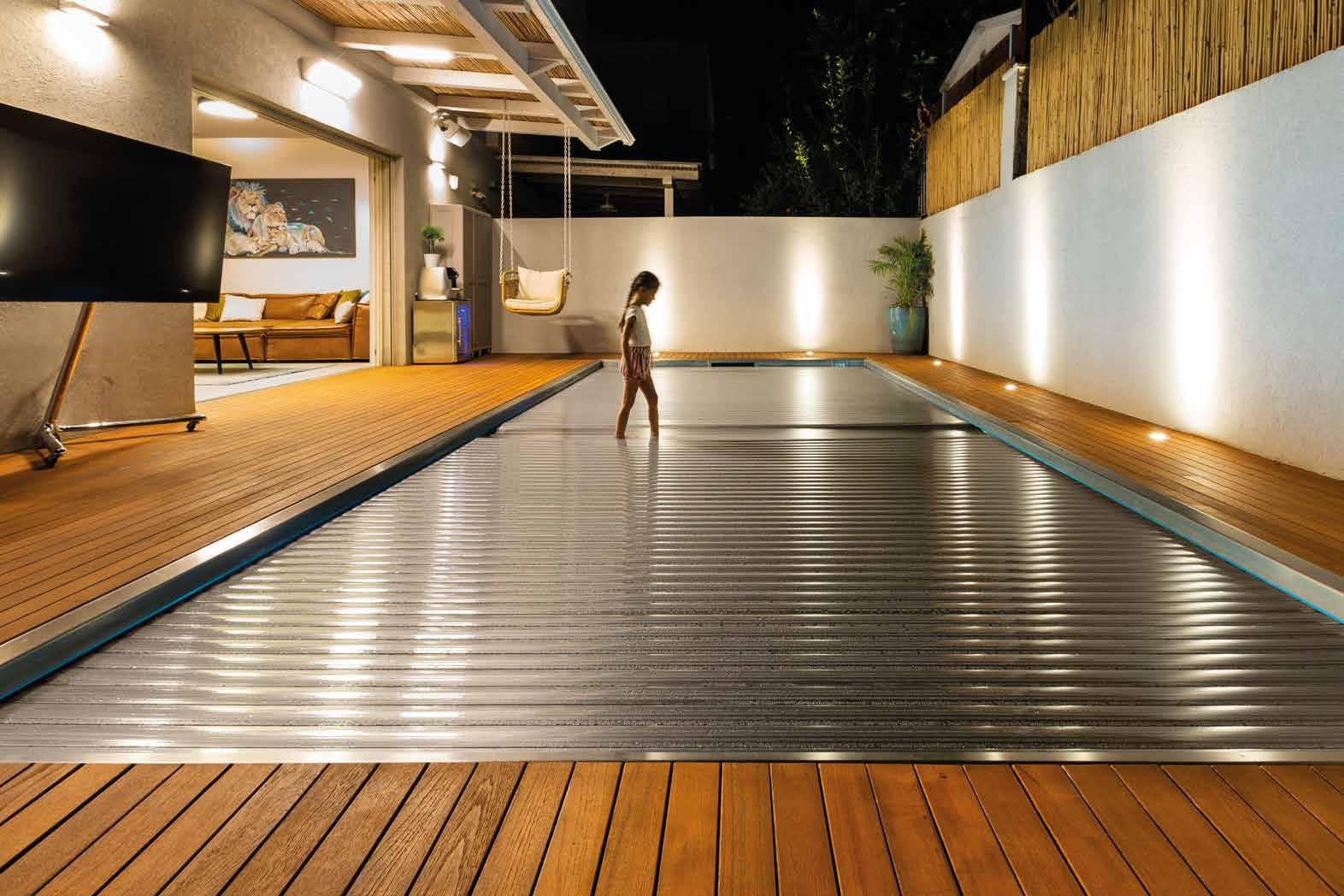 Zvedací bazénové dno spojuje nadčasový design s moderní technologií a představuje elegantní řešení zastřešení bazénu bez nároků na okolní prostor. Tento systém umožňuje nastavit libovolnou hloubku v bazénu, od dětského brouzdaliště až po plavecký bazén. Když je dno zcela zvednuté a bazén je uzavřen, rozšiřuje terasu či odpočinkové prostory. Automatické ovládání zajišťuje bezpečnou a snadnou manipulaci, systém lze napojit i na chytrou domácnost.