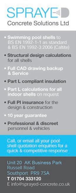 Aqua Publishing Ltd accepts no liability for any insert, display or classified advertisement included in Swimming Pool News. While every reasonable care is taken to ensure that all advertisers are reliable and reputable, Swimming Pool News can give no assurance they will fulfil their obligations under all circumstances. The views expressed in the articles in Swimming Pool News are the contributors’ own. All rights reserved. Copyright for all materials published in SPN remains with the publishers. Material contained in this publication is not to be reproduced in whole or in part without the prior permission of Aqua Publishing Ltd.