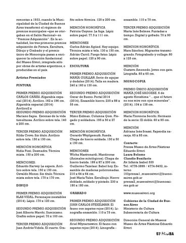 MENCIÓN HONORÍFICA Nidia Pizzi. Desmadre. Técnica mixta. 150 x 200 cm. MENCIONES: Eduardo Harvey. La espera. Acrílico sobre tela. 150 x 150 cm. Osvaldo Monzo. Sin título. Técnica mixta sobre tela. 170 x 170 cm. DIBUJO PRIMER PREMIO ADQUISICIÓN BLAS VIDAL. Personajes inestables (2014). Lápiz. 170 x 120 cm. SEGUNDO PREMIO ADQUISICIÓN José Alberto Marchi. Iluminismo. Grafito sobre papel. 70 x 100 cm. TERCER PREMIO ADQUISICIÓN Juan Andrés Videla. El cuarto. Gra-