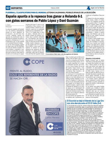 El escurialense Pablo López, ante dos jugadores de Holanda llegó el primer gol de fabricación serrana, obra de Pablo López a servicio de su compañero del Floorball El Escorial, Borja García. El 3-1 dio mucha seguridad en su juego al combinado nacional, que resolvió en el tercer tiempo con un gol del capitán, Sergio Garcés, y dos dianas casi consecutivas, obra del escurialense Dani Guzmán y de nuevo de Anton Sjolund. La victoria por 6-1 en el partido más incierto sobre el papel, por estar enfrente un rival muy próximo en el ranking mundial -Holanda es el número 23 y España el 19-, deja a la selección en una inmejorable posición para cumplir con su objetivo de ser segunda de grupo y jugarse el pase al Mundial de Helsinki en el cruce de repesca con el subcampeón del Grupo B, plaza que con total seguridad será de Alemania (número 5 del mundo) o de la selección anfitriona de Letonia (número 8). Se da por hecha una segunda victoria española ante Liechtenstein, de-