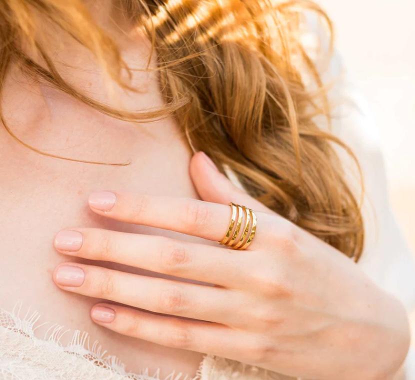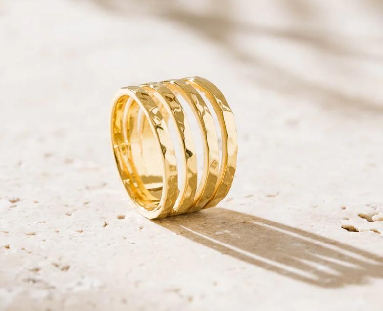Take a look at our quad line 14ct gold vermeil ring, handmade in India by our skilled artisans. They have applied a technique called hammering in order to create uneven textured dents all over the piece, that catch the light beautifully.