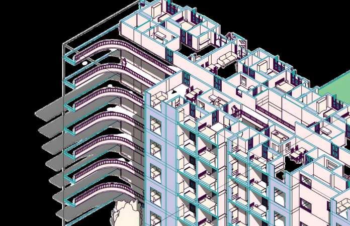 At the intersection of the blocks, the units face each other, jeopardizing the privacy. To address this, the balcony is treated with a perforated jaali wall, which ensures that no view into the living room of the adjacent unit happens.