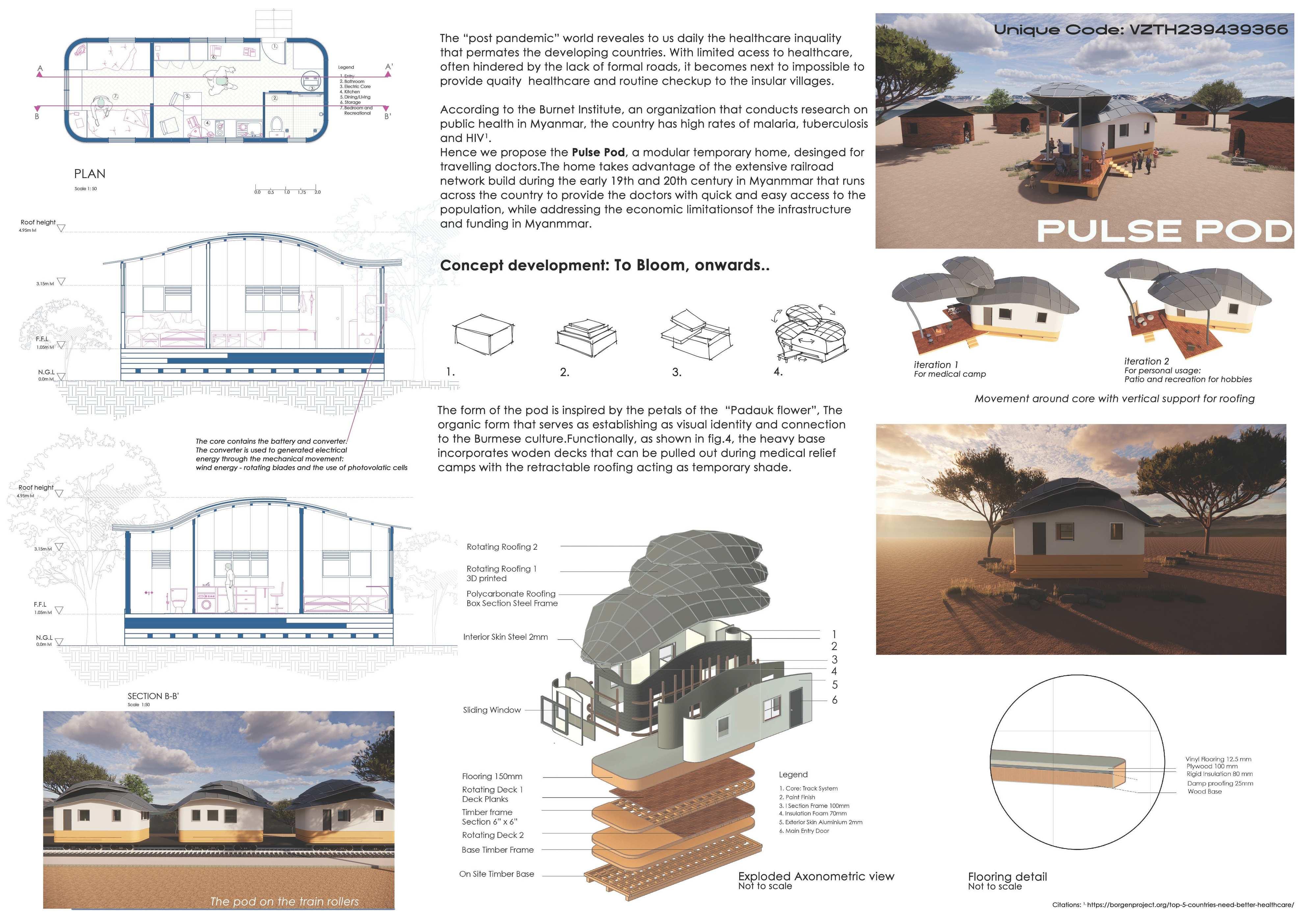 Designing a tiny house suitable for two people to live in. Designed for doctors on camp visits to other places. Zoning spaces considering the basic requirements for them to live in and also to create spaces for working and serving the people. Concept of transporting these pods by train, to make healthcare more accessible to all.