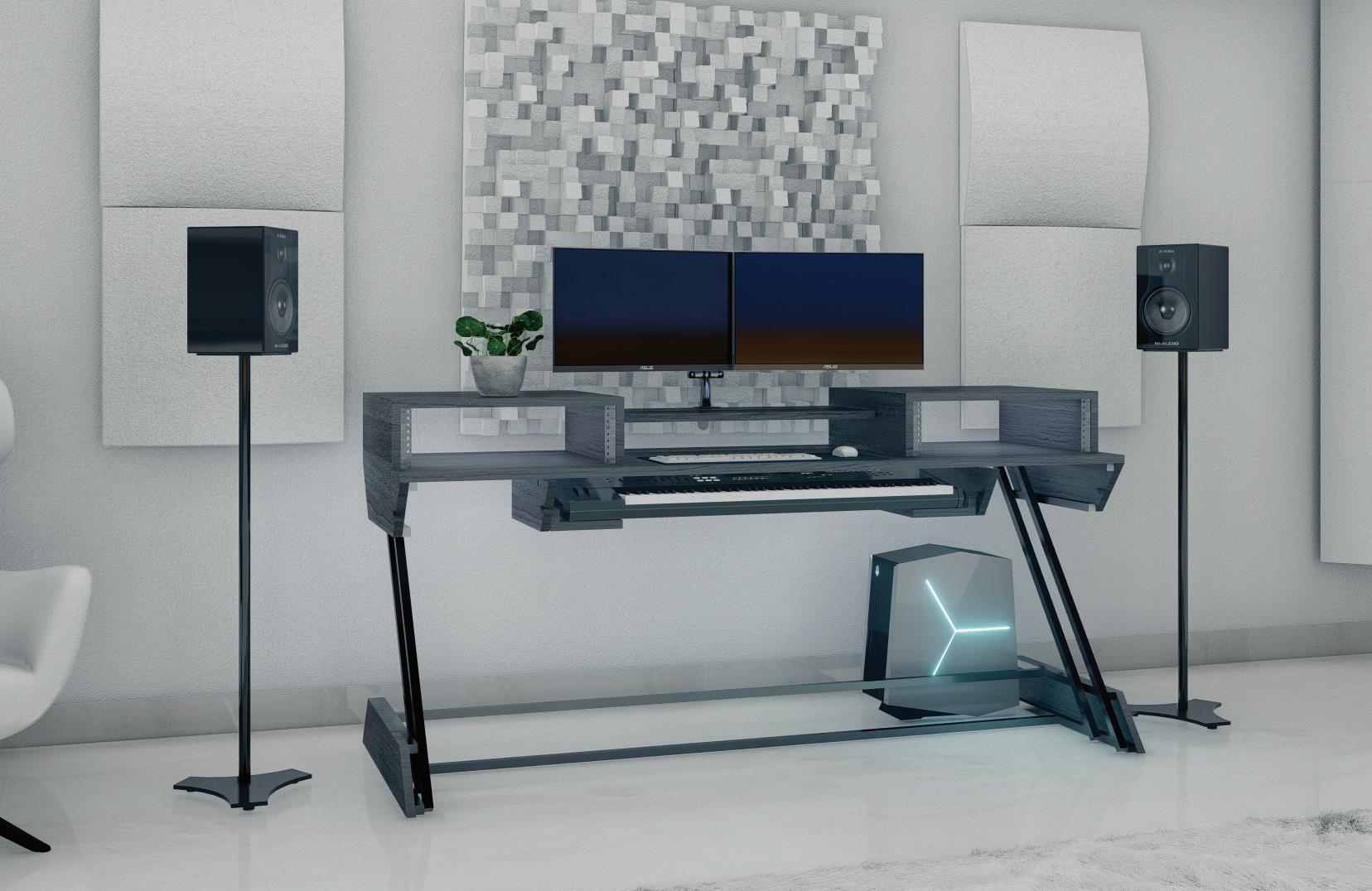 Music Keyboard Music Keyboard PC Dual Monitor Mount 2 x 1U slot 2 x 1U slot Pullout for PC control devices Pullout for PC control devicesSwitched Music Keyboard and PC input devices to make comfortable positions for both. Added width adjustable pullout for Music Keyboard to adapt to various sizes. Standard 1U Slots moved up for easy reach.