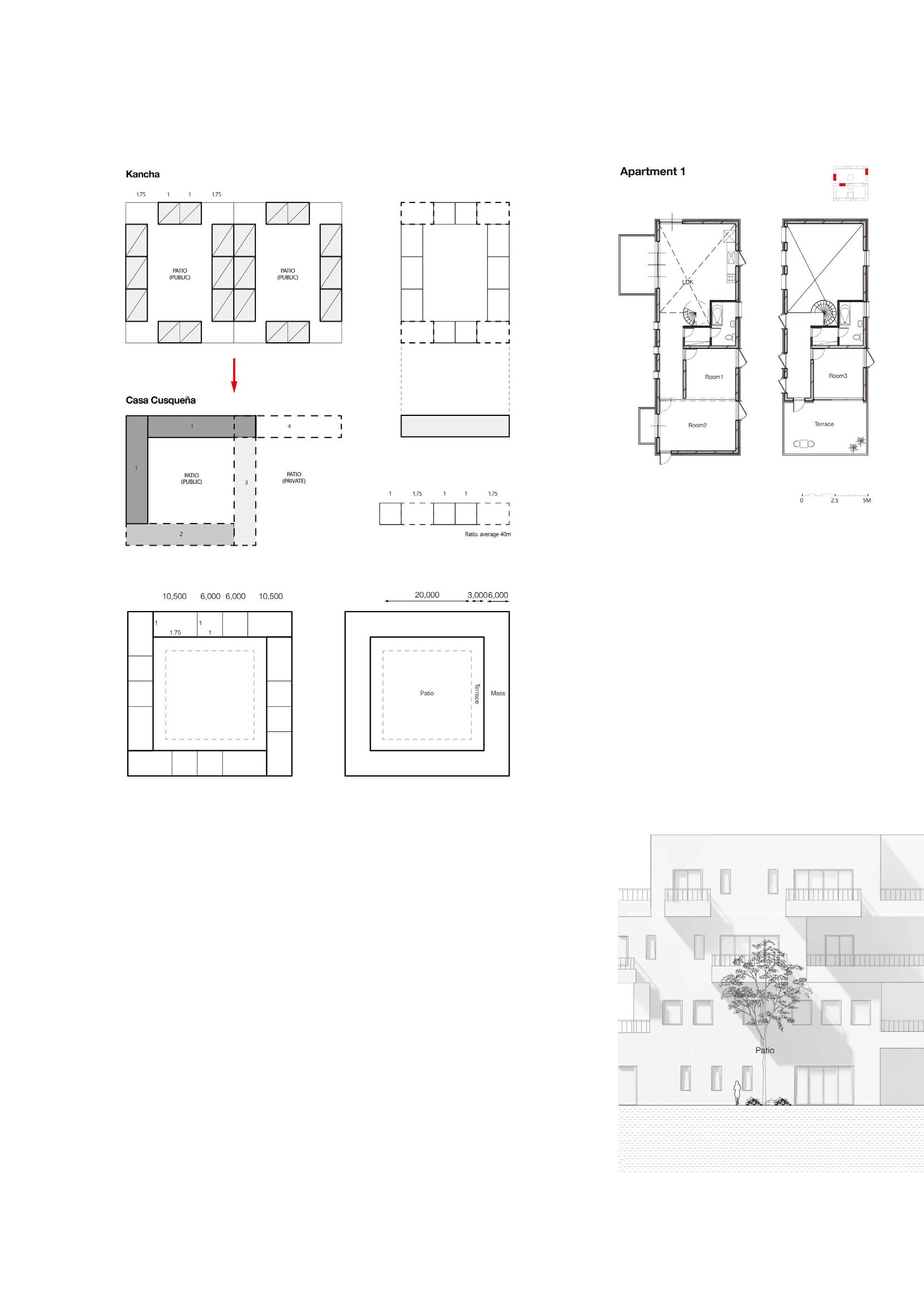 Therefore within the master plan, the blocks are designed with patios of sizes that correspond to the dimensions of the existing kancha and casa, specifically 40x40m and 15x15m, respectively. The existing arcade on the sides of the patio can be expanded into balconies, allowing for ideal residential spaces with a maximum width of 3m.