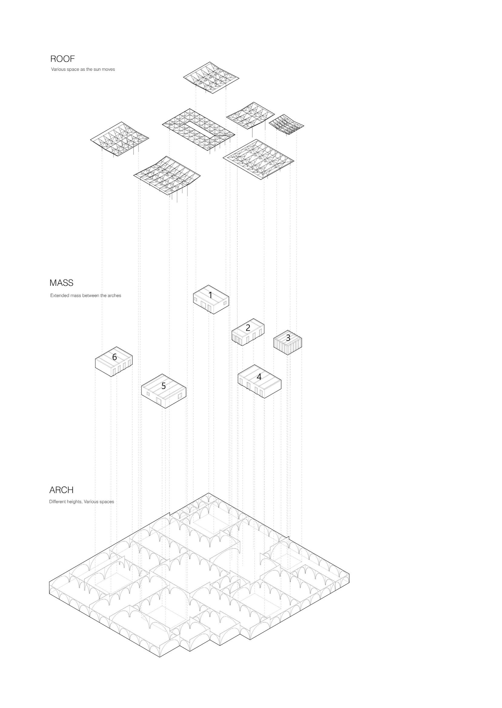 A slightly larger roof than the masses generates changing shadows over time, enriching the market space and creating an ambiguous and boundary-less environment.