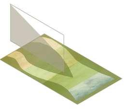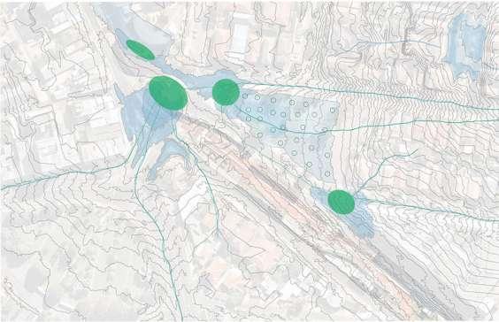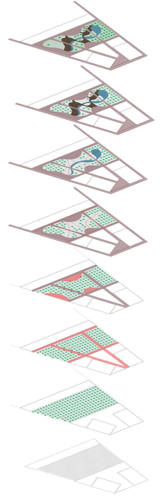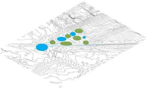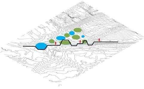 Contours are mapped and topographical modifications are carried out to create a series of connected water bodies around the plotted habitat islands.
