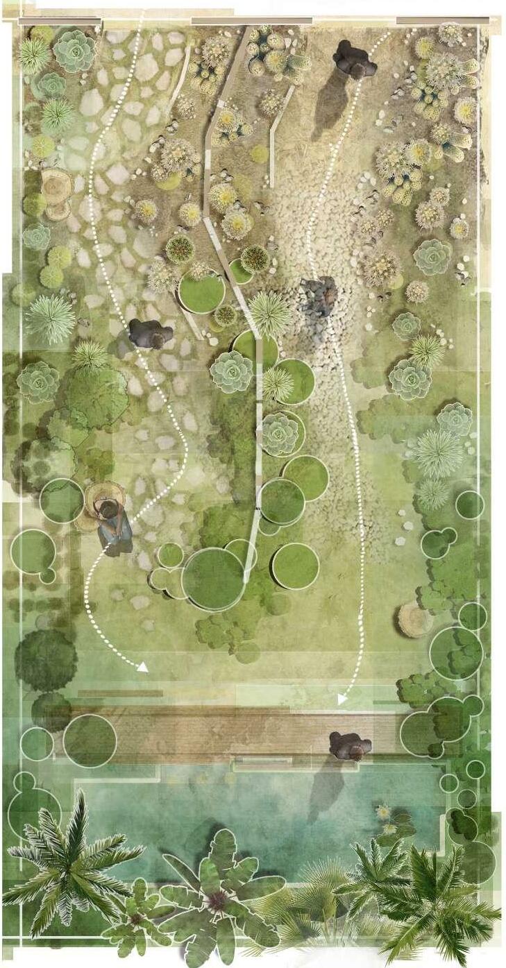 The entries also become each other's exists, therefore the visitor has to experience the harsh environment again before leaving the garden as a humble reminder of the struggles they have been through. It is also conveying that hardships may come again.
