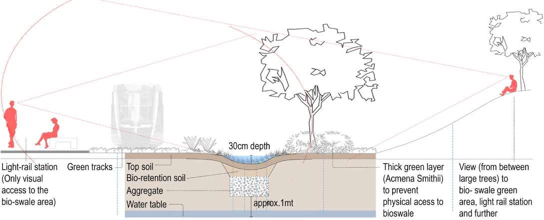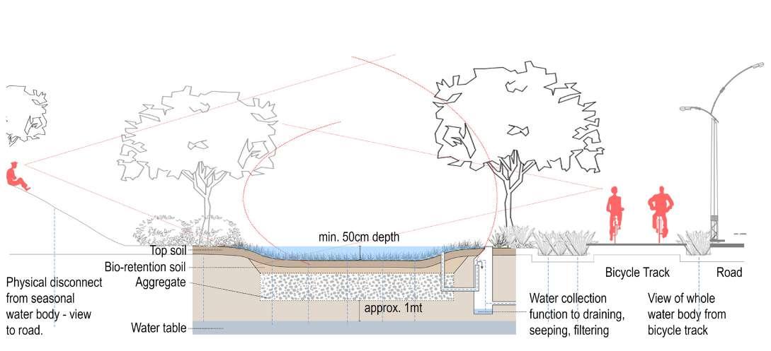 The design results in three distinct water bodies from south to north. Firstly the existing Wolli Creek; next, beyond the habitat islands shallow ponds with plants of filtrating abilities to provide a cleaner environment and passage of linked ponds for aquatic animals such as the long-finned eels; and lastly pond pools with further filtered water through and underground filtration system therefore the water is safe for people to swim.