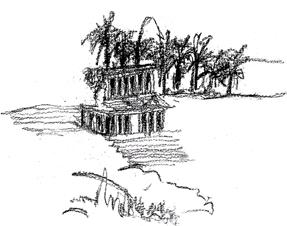 Sketch of the stairway and entrance to the meditation space at the last level of the centre.