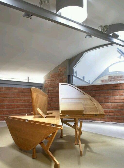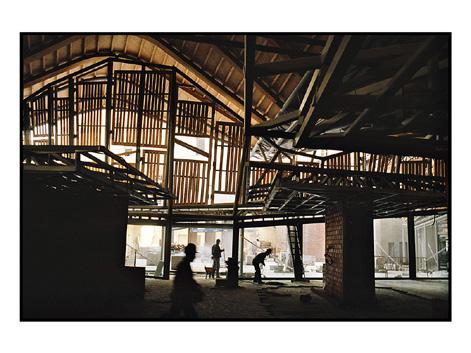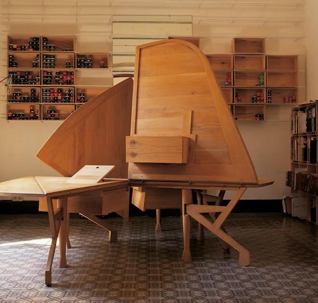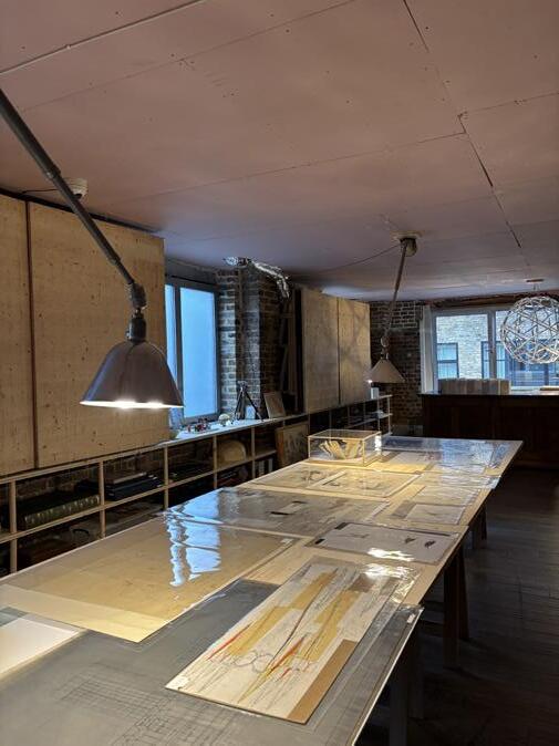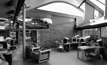 The studio is an open-plan space with a mezzanine level. Facilities include a kitchen, adjustable drafting tables, drawing boards, and modular shelving, all adaptable to the needs of different workshops. A small workshop beneath the mezzanine provides space for model-making activities.