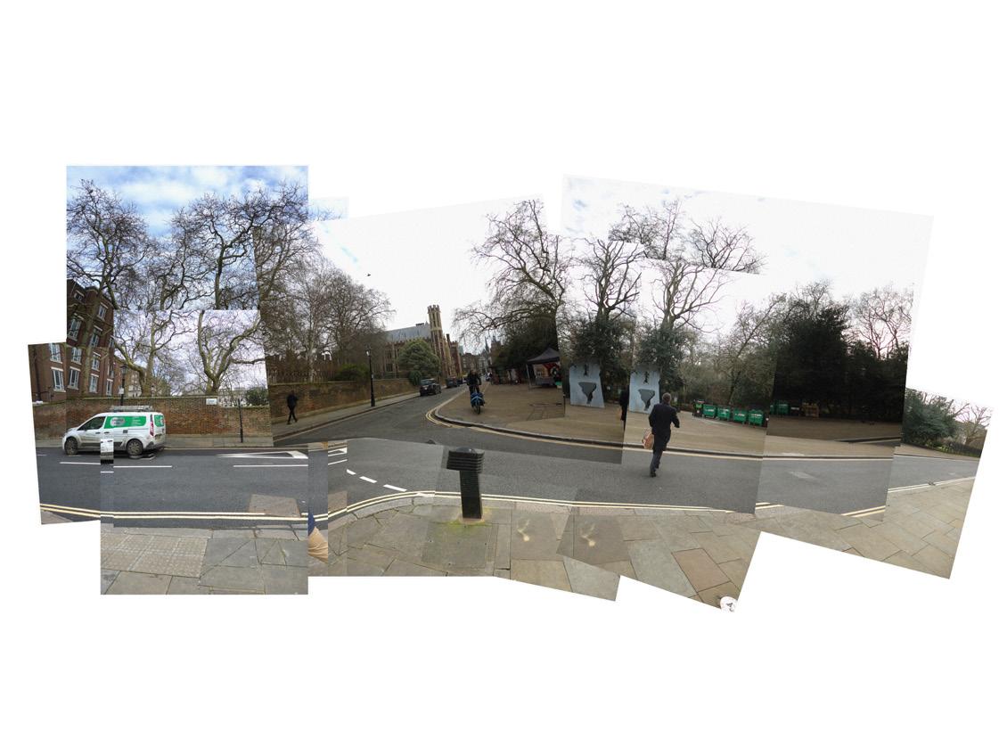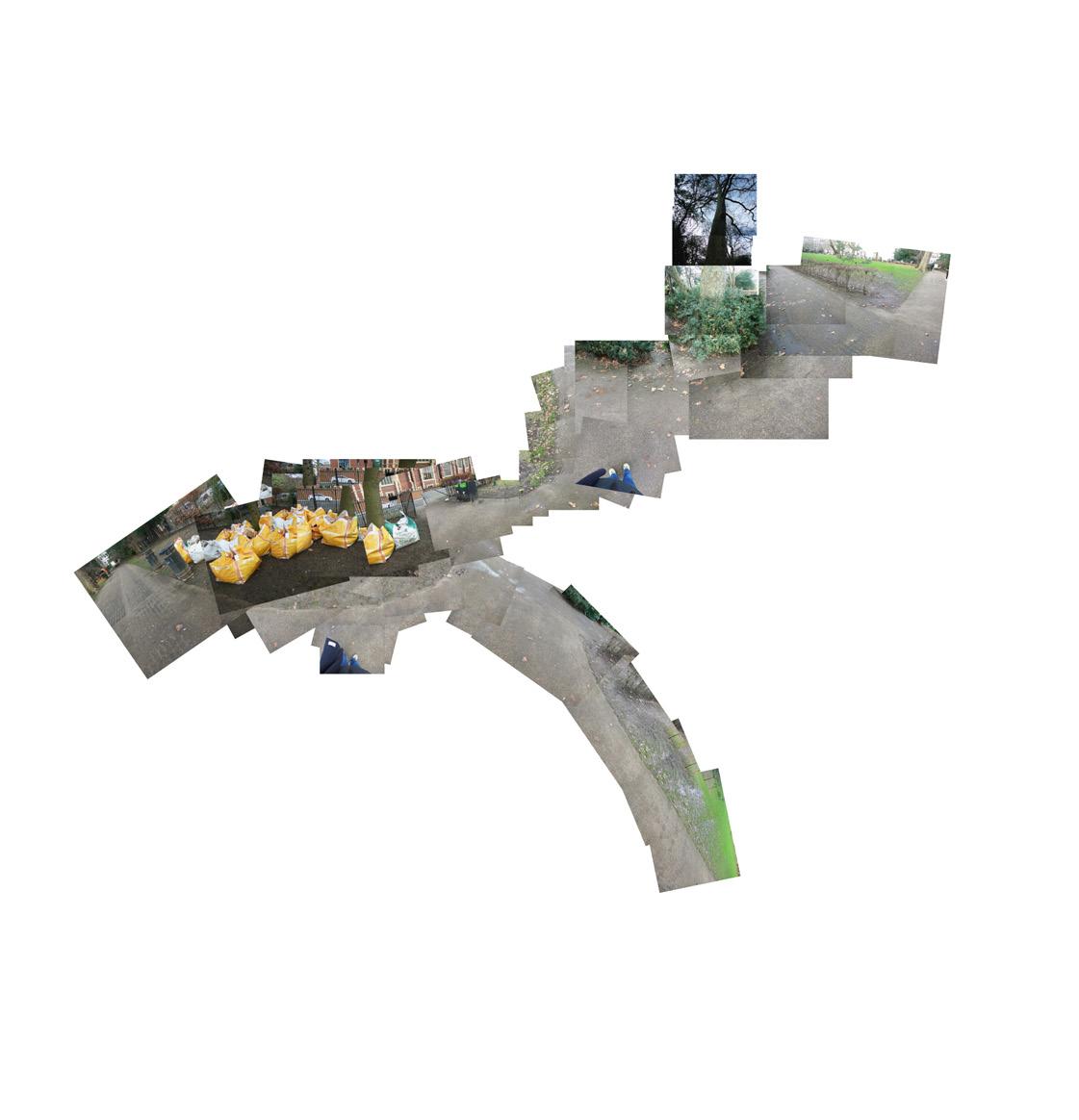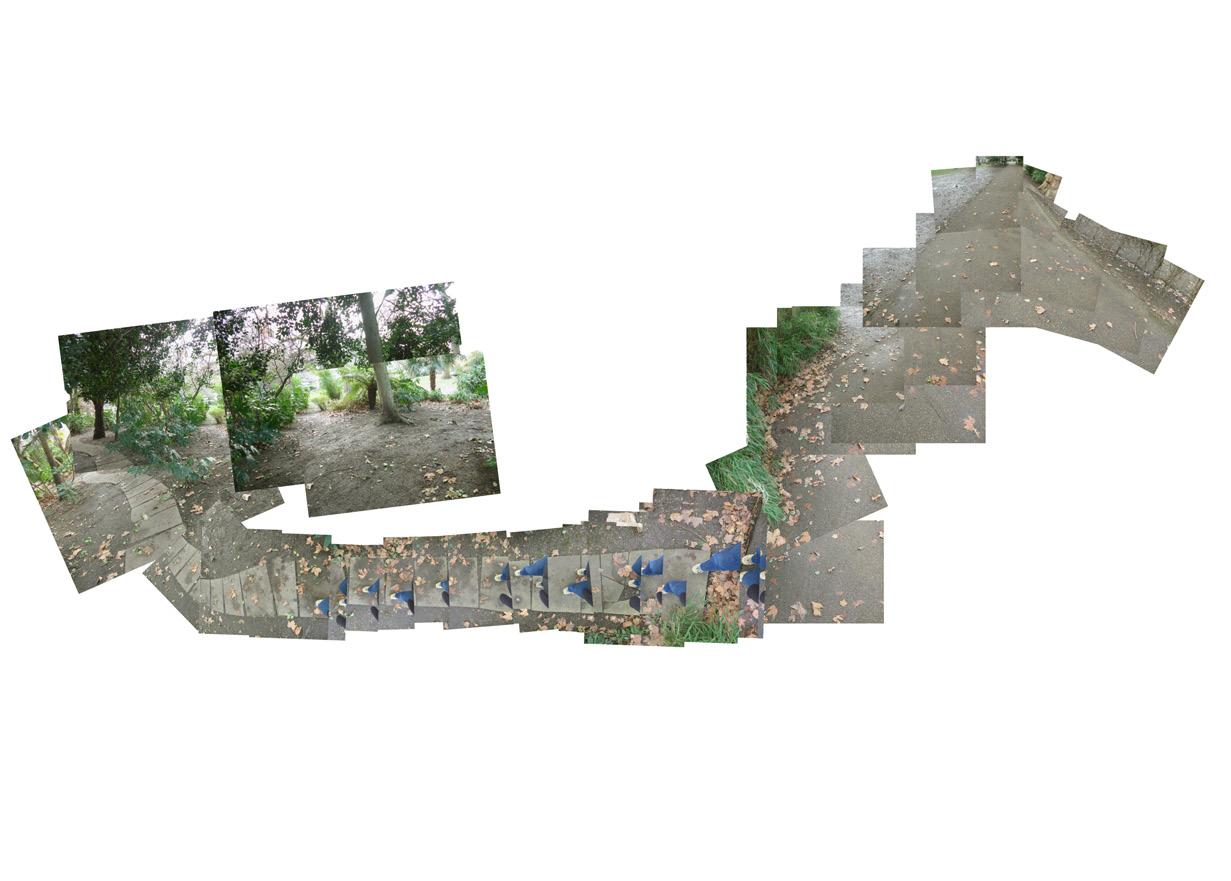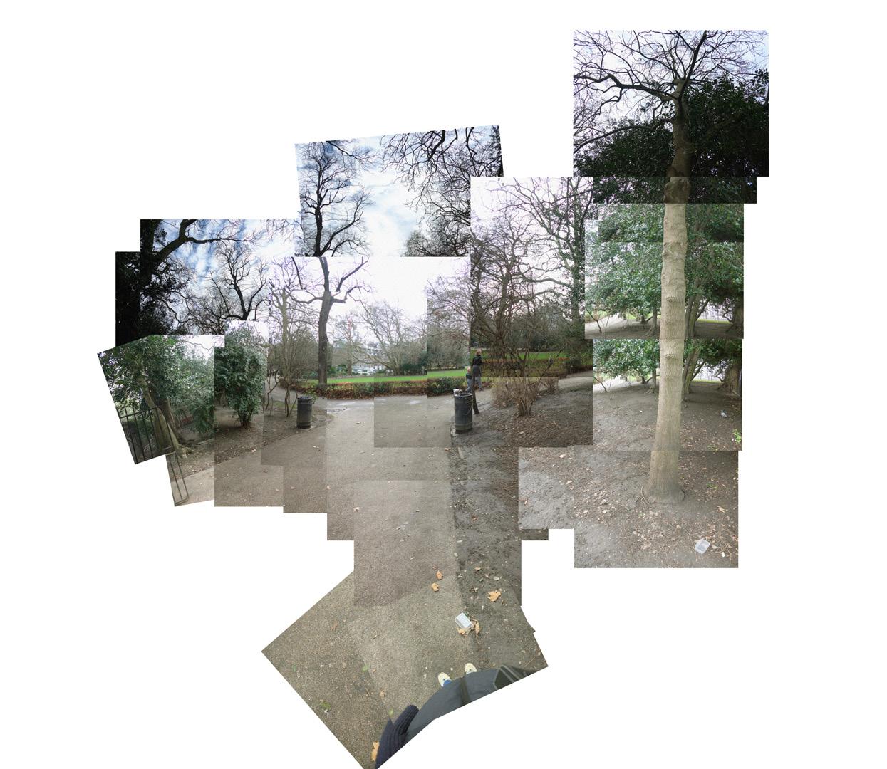 The site is a semi-rectangular field with seven points of entry along its perimeter. It acts primarily as a space of movement, with moments of pause when weather permits. This flow is reinforced by the formal arrangement of benches placed along the concrete paths that trace the edge of the park. The nature of the drawing came about by revisiting the film made on site along side the collages taken from various points in the park. Together the development of new pathways and routes in the field have been discovered.