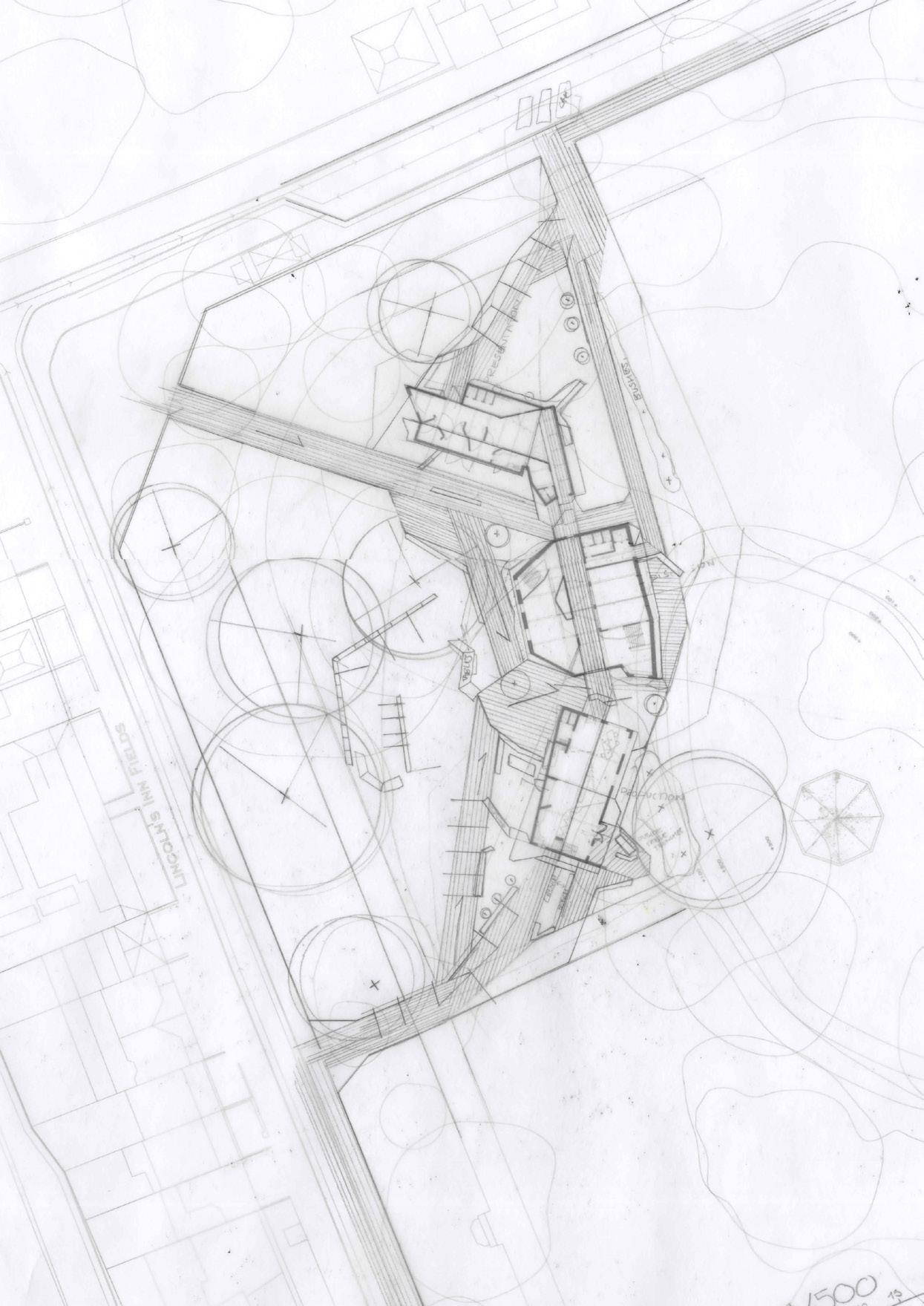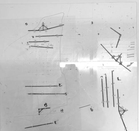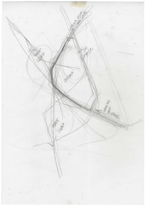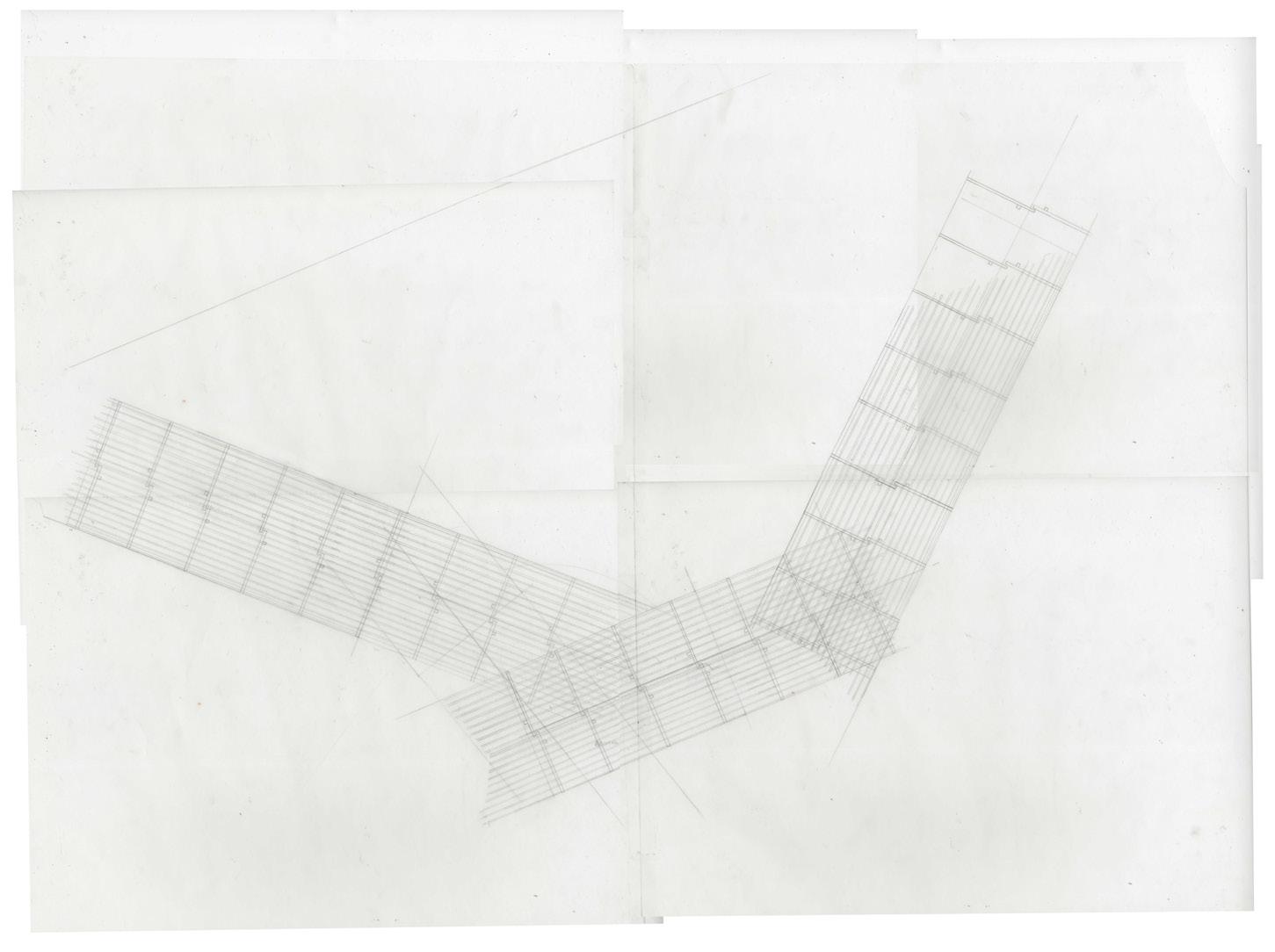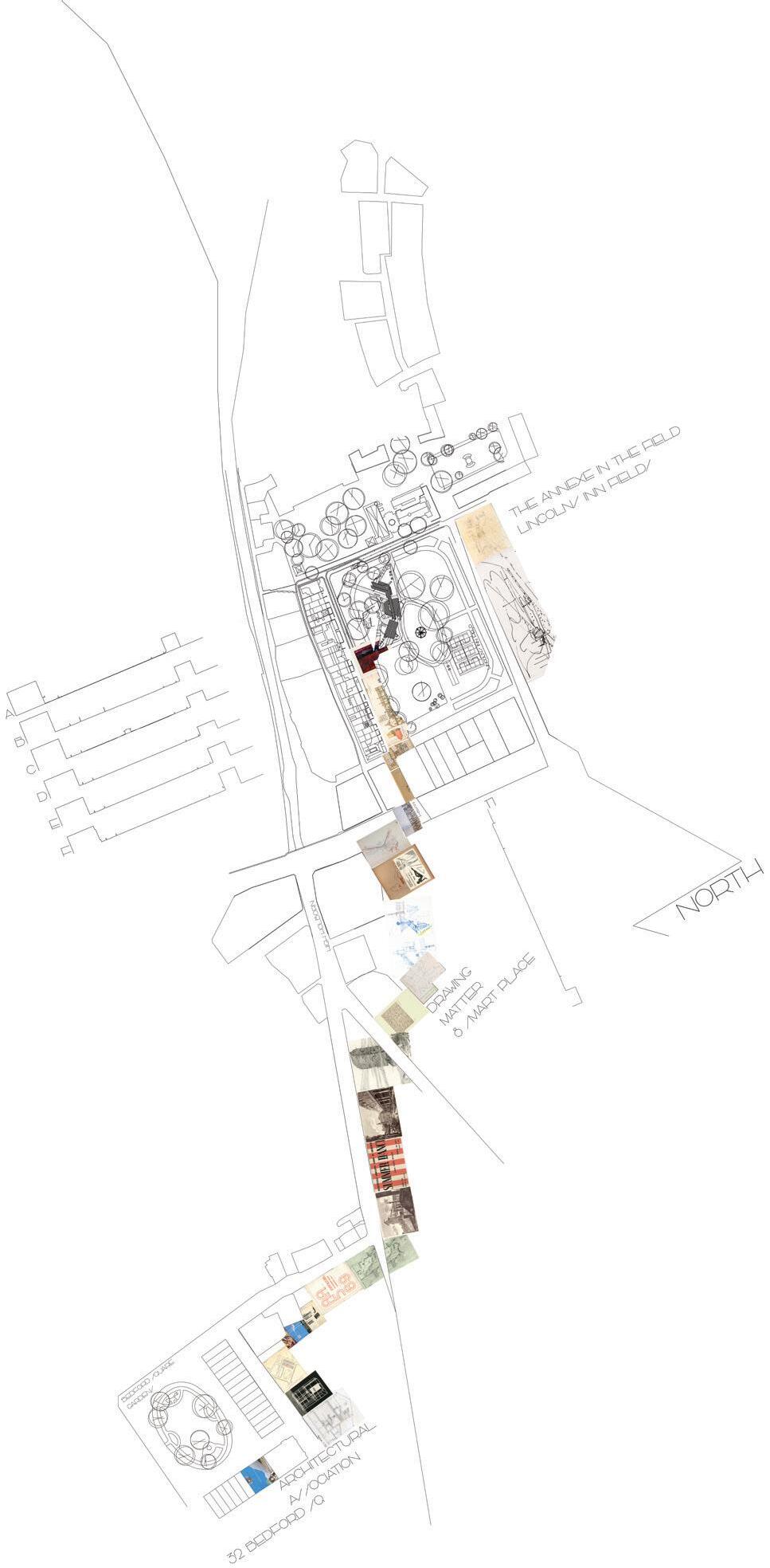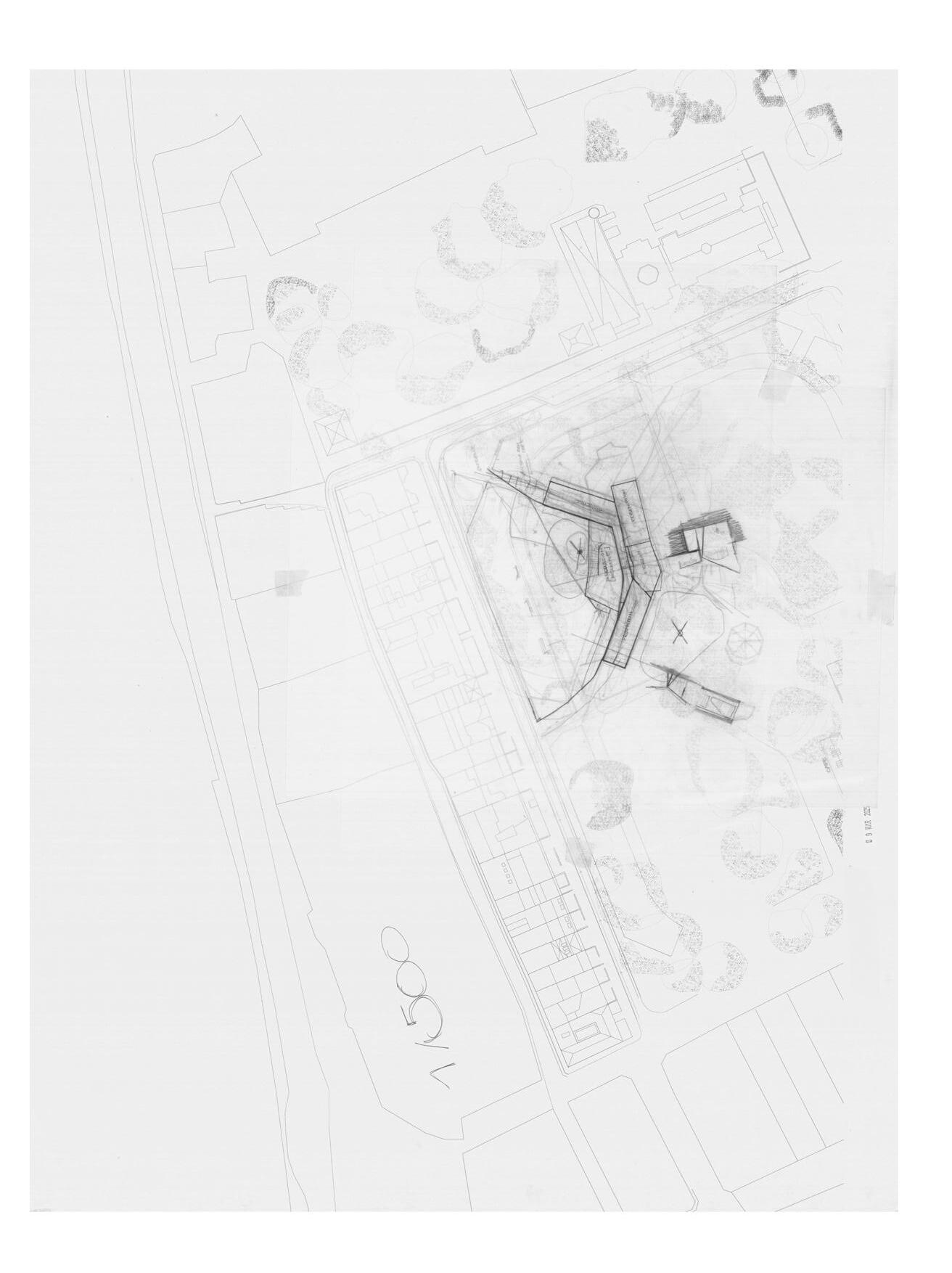 The site is a semi-rectangular field with seven points of entry along its perimeter. It acts primarily as a space of movement, with moments of pause when weather permits. This flow is reinforced by the formal arrangement of benches placed along the concrete paths that trace the edge of the park. The nature of the drawing came about by revisiting the film made on site along side the collages taken from various points in the park. Together the development of new pathways and routes in the field have been discovered.