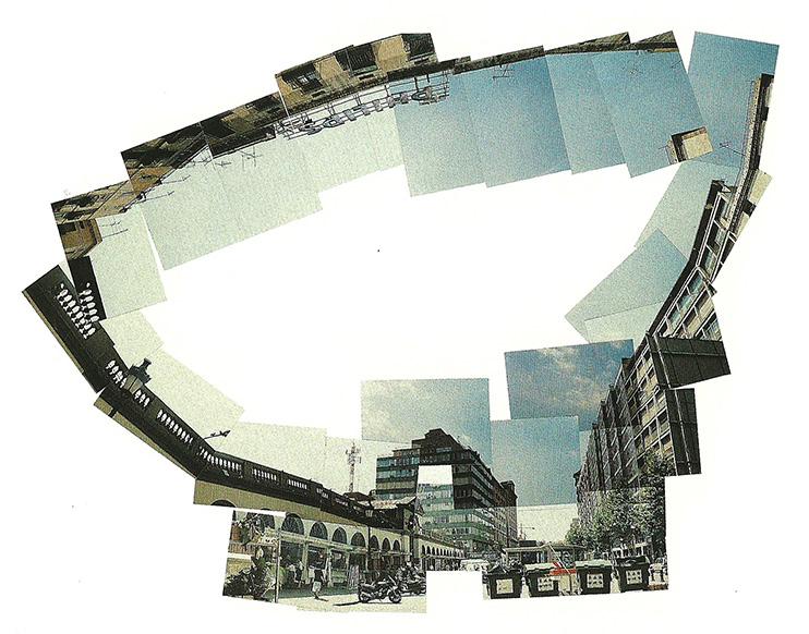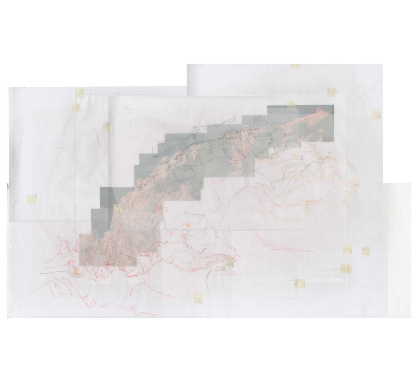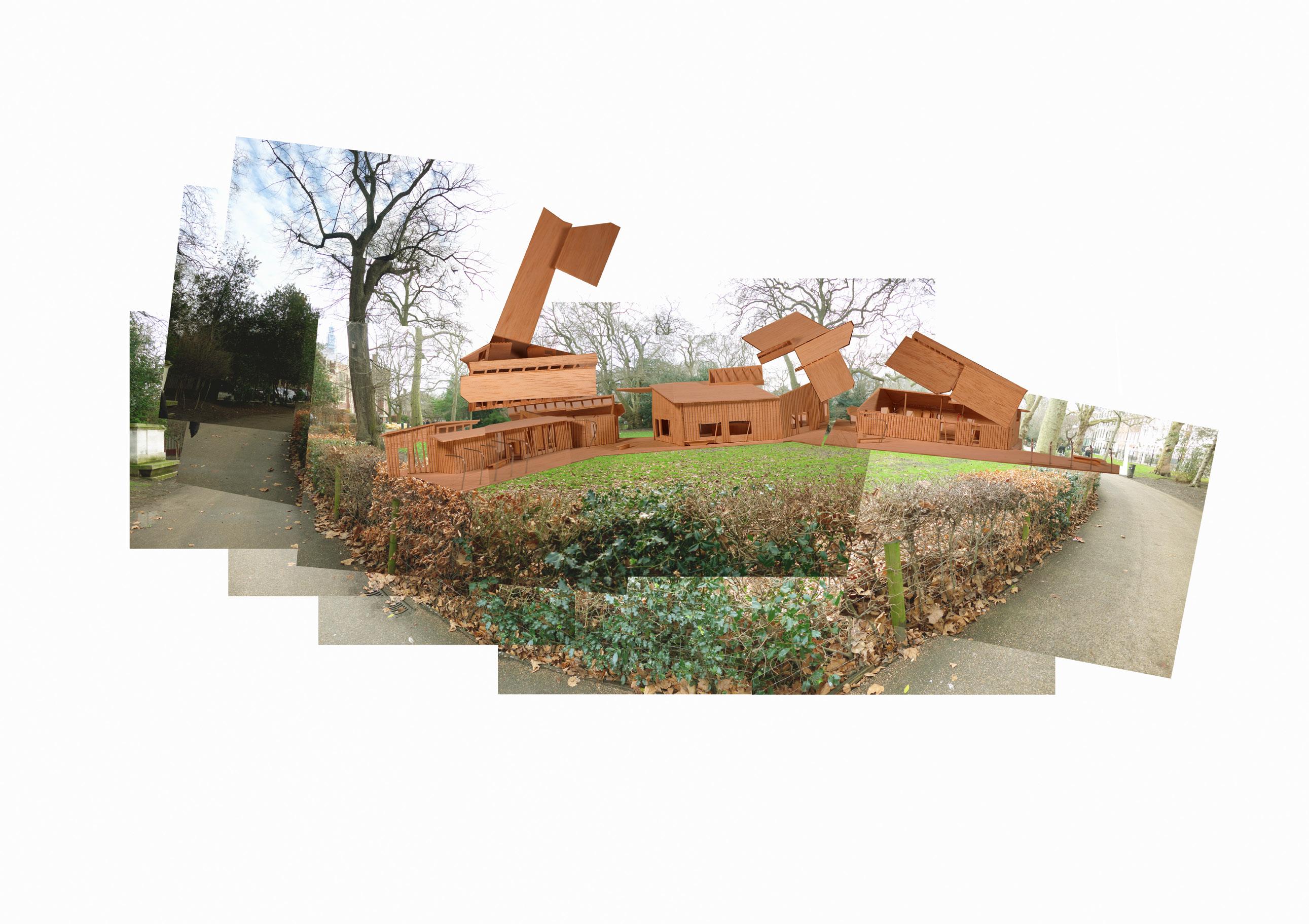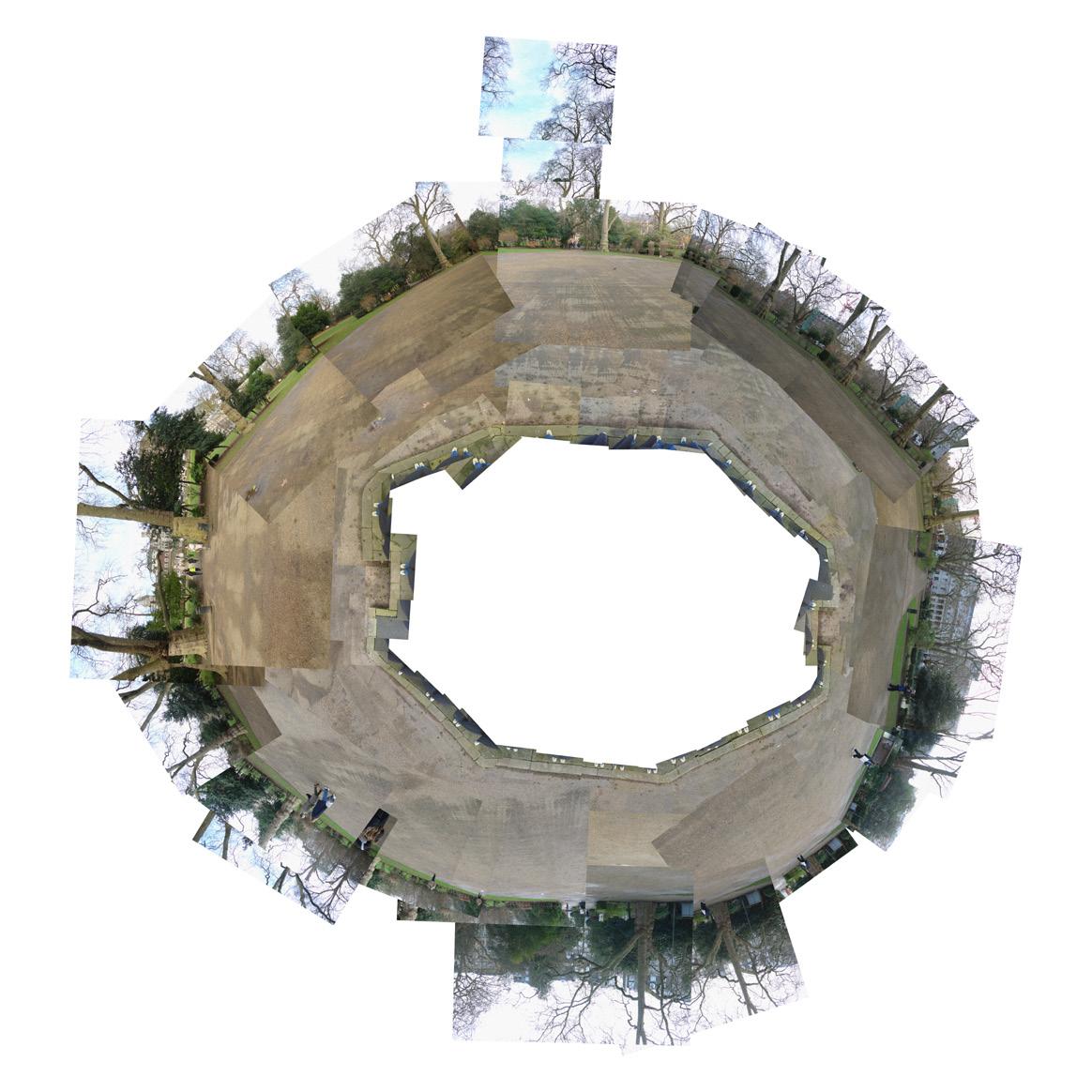 The site is a semi-rectangular field with seven points of entry along its perimeter. It acts primarily as a space of movement, with moments of pause when weather permits. This flow is reinforced by the formal arrangement of benches placed along the concrete paths that trace the edge of the park. The nature of the drawing came about by revisiting the film made on site along side the collages taken from various points in the park. Together the development of new pathways and routes in the field have been discovered.