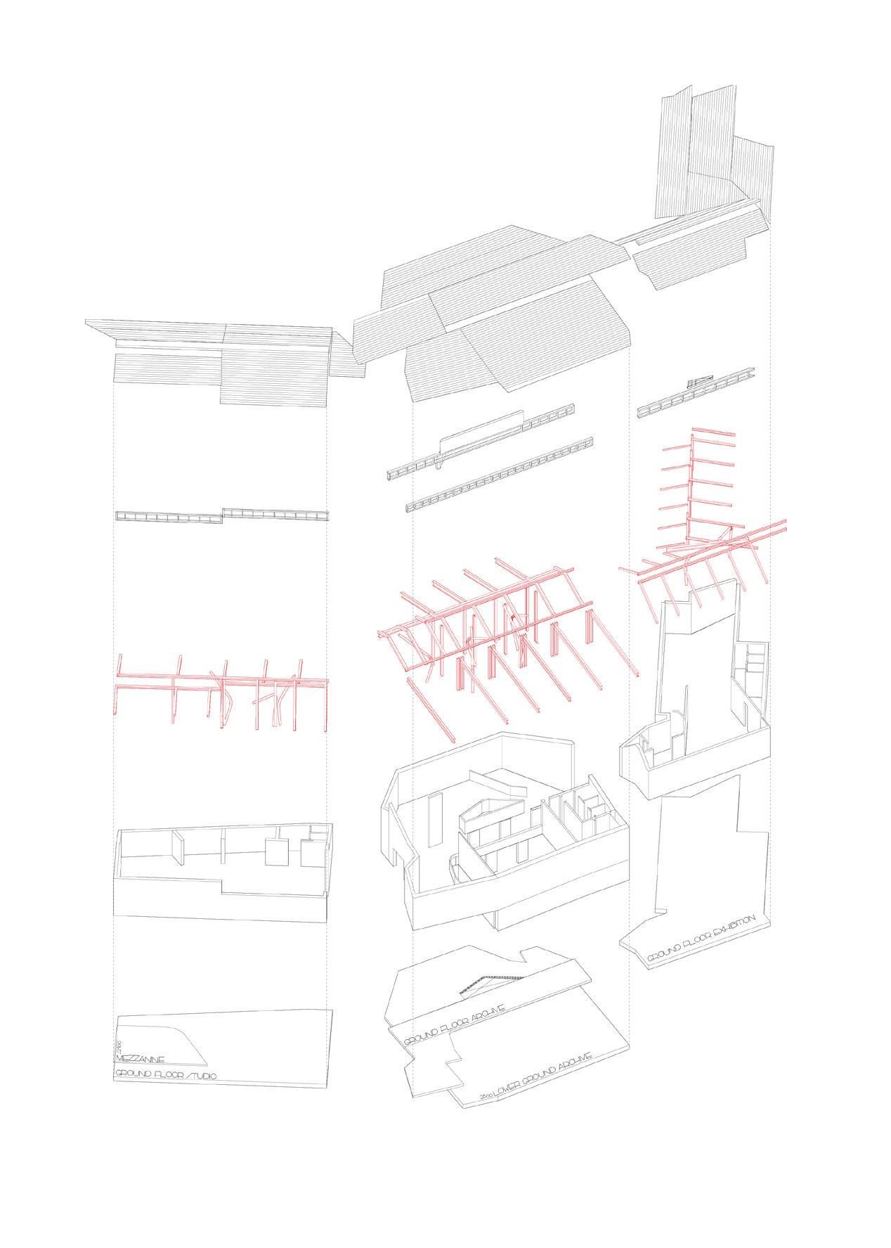 The proposal for Lincoln’s Inn Fields will serve as an annexe to the existing archives of Drawing Matter and the Architectural Association (AA). Conceived as an extension of programme, the annexe acts as an intermediary space between public and private realms. While standing independently from both institutions, it remains within close proximity, easily reached on foot. Working in close collaboration with Drawing Matter and the AA, the annexe builds upon Drawing Matter’s existing ethos of learning through archival drawings and hosting workshops.