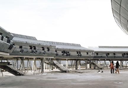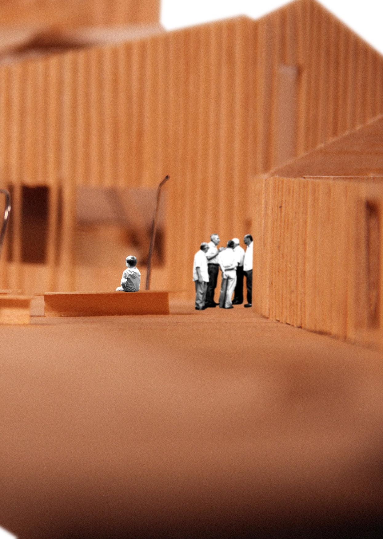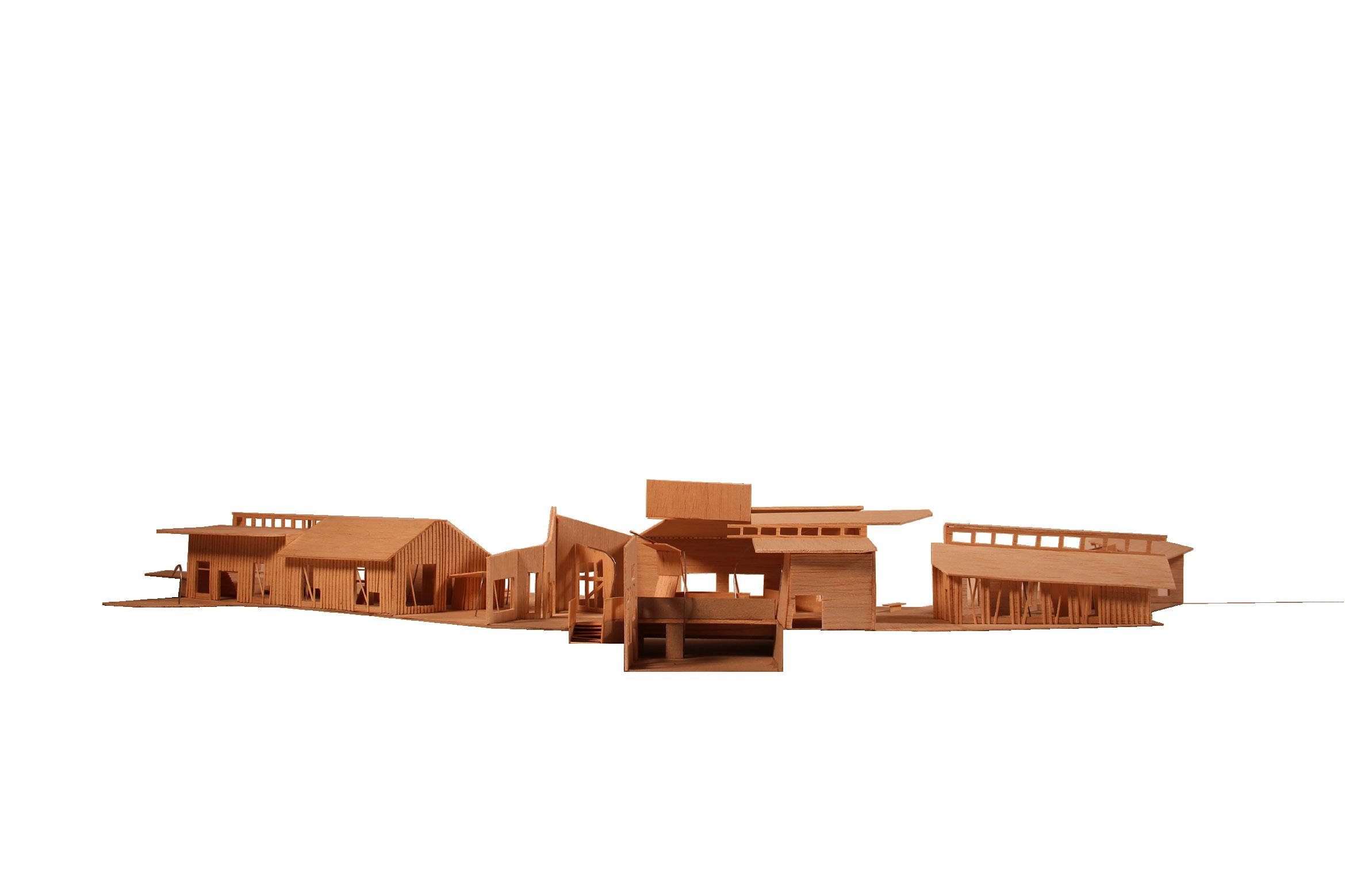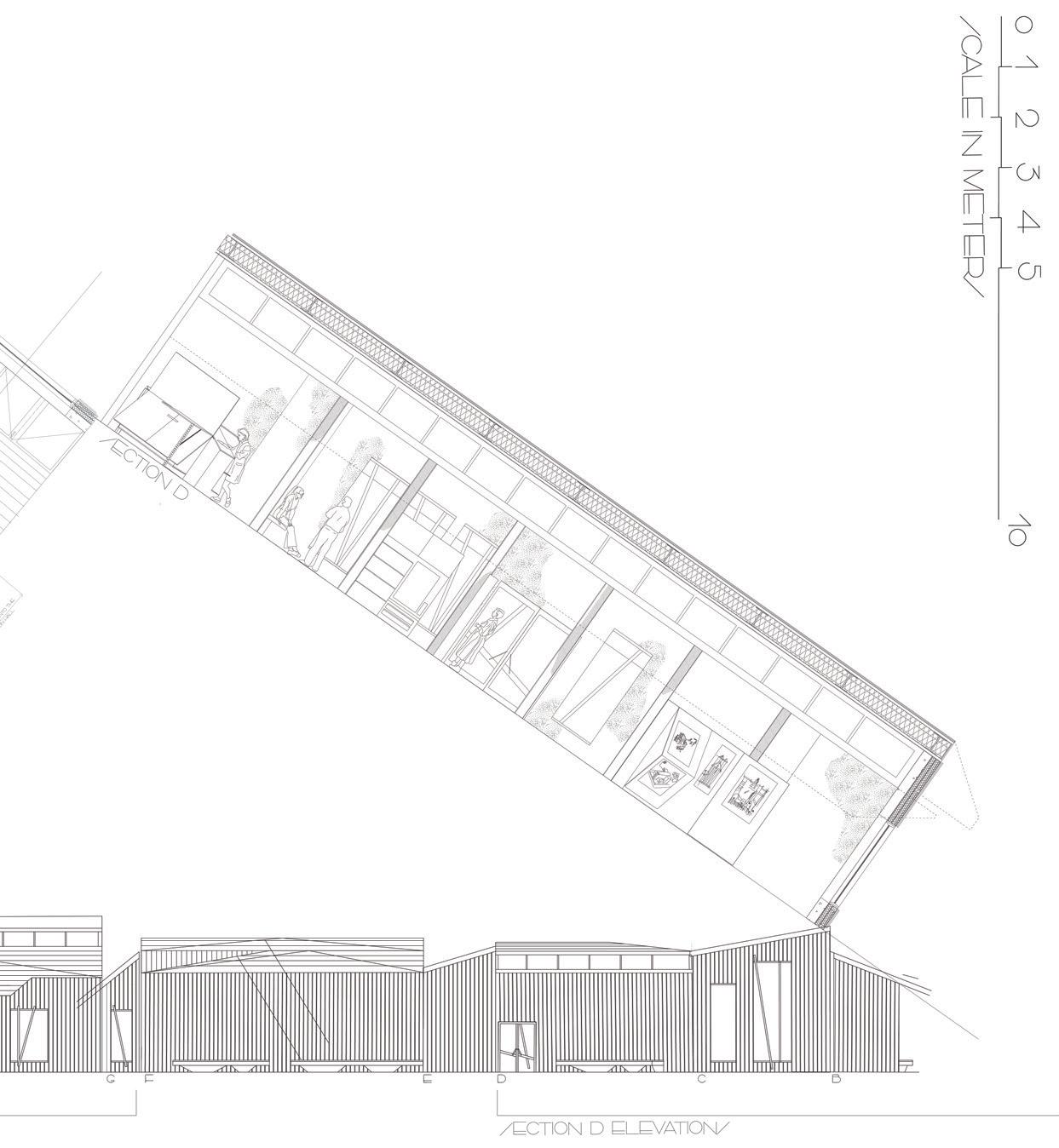 The three buildings function together to form the cyclical environment of the annexe. Each building is equipped with custom-designed furniture, specifically tailored to its function ( discussion, production, presentation). These pieces are integrated into the architecture, ensuring flexibility and adaptability for various activities. Covered by a single roof, the buildings provide an open, monitored space where the arrangement of furniture facilitates seamless interaction between